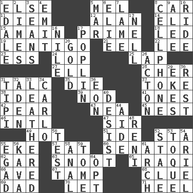ACROSS 1. Otherwise 5. Cartoonist voice _ Blanc 8. Automobile 11. South Vietnam president (1954) 12. Actor Alda or Thicke 14. Biblical high priest 15. With great haste 17. First class 18. Directed 19. Small, flat, pigmented spot on the skin 21. Snakelike fish 22. Area sheltered from the wind 23. Curvy letter 24. Chop off 25. Infant locale 27. Pipe bend 28. "Mermaids" star 31. Baby powder 35. Pass on 37. Casino tip 38. The content of cognition 39. Lower and raise head in agreement 41. Singles 42. Lightbulb-shaped fruit 43. Teachers' org. 45. Egg locale 46. International (abbr.) 47. Title for a knight 49. Being at a high temperature 51. Binary compound 52. R.R. building 55. Make supply last 57. Consume 60. Legislator 62. Slender fish 63. Snout, nose 65. Resident of Iraq 66. "___ Maria" 67. Pack (down) 68. A slight indication 69. Male parent 70. Allow 71. Person who is morally reprehensible DOWN 1. Peak District village in England 2. Citrus fruits 3. Seines 4. Send forth 5. Third mo. 6. Writer Wiesel 7. Unable to walk 8. Portable communications device 9. Toward shelter 10. Travel on or in a vehicle 13. 1994 drama film starring Jodie Foster 16. Mediterranean tributary 17. Cotton for raincoats, e.g. 20. Gilt 26. Gambison 29. Makes supply last 30. Respite 31. Native american tent (variation) 32. Arabian gulf 33. Tough but pliablecoriaceous 34. Monte _, Las Vegas Hotel/Casino 36. A really long time 40. Cease 44. Assistant 48. Painter Guido (1575-1642) 50. Trial 52. Having lost freshness 53. Woman's close-fitting hat 54. Satellite of Uranus 55. Mild oath 56. Polynesian shrub of the pepper family 58. Of or related to the anus 59. Heavy book 61. Bowlike part 64. Elect