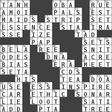 ACROSS 1. Hyperbolic tangent 5. Chief or king in Benin or Nigeria 8. Regret 11. Mine, in Marseilles 12. Friends 14. Eastern Standard Time (abbr.) 15. Unmarried girls 17. Empty completely 18. Arrange properly for use 19. Center 21. R.R. building 22. Lyricist Gershwin 23. Compass dir. 24. Ending with capital 25. Bit 27. Infant food 28. Puts into a specified state 31. Actor Lugosi 35. To riddle 37. In a ____ (agitated or irritated) 38. Lyric poems 39. Heredity factor (abbr.) 41. 1/640 square mile 42. Prejudice 43. Period 45. Confront 46. Stalk of a moss capsule 47. Music discs 49. Part of HMS, perhaps 51. Beverage made from leaves 52. ___ good deed 55. Purpose 57. Curvy letter 60. Heighten or intensify 62. Automobile 63. Principle of right and wrong 65. Underwater navigation system 66. Falsehood 67. Spoils 68. Suttee (variant) 69. Say or write further 70. Parent Teacher Association (abbr.) 71. Woody plant DOWN 1. Corrects by punishment or discipline 2. Collect or gather 3. Annoying sound 4. Flintstone garb 5. Elect 6. Drinking establishments 7. Set down 8. Home 9. One who uses or employs something 10. Singer James 13. Argument over a trivial matter 16. Sever or remove by pinching or nipping 17. Oozed 20. Russian ruler of old 26. Indian state 29. Become fatigued 30. Proofreading order 31. Moves up and down 32. Singer Brickell 33. Resembling or made to resemble leather 34. Slender Brazilian palm 36. Compass dir. 40. Northern region 44. Arabian gulf 48. Backtalk 50. Sew up the eyelids of hawks and falcons 52. Middle Eastern gold or silver currency 53. Speak pompously 54. Nest on high 55. Southern CA. univ. 56. Stated 58. Halt 59. Opportunity 61. Mail 64. Call ___ day