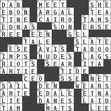 ACROSS 1. Small moist lump or mass 4. Rendezvous 8. A female animal or person 11. Inky black, to poets 13. Therefore, facetiously 15. Afternoon social gathering 16. Prong on a fork 17. Capital of Egypt 18. Scottish caps 19. Ferber et al. 21. Male child 22. Celtic language 23. To riddle 24. Car or cant ending 27. Set 29. Lie 30. Schedule 34. Compass dir. 36. Deliberation 39. Off limits 40. Naughty children 41. Unadorned figures 43. Falls behind 44. Disturbances 46. Burn superficially 47. Call ___ day 48. Nick name for Arthur 49. Periodic rise and fall of the sea level 51. Corporate head (abbr.) 53. Compass dir. 54. Remaining after all deductions 57. Travel by water 60. Lair 63. Puts on (as clothing) 65. Johnson of "Laugh-In" 66. Peak District village in England 69. Inactive volcano in Sicily 70. Whopper 71. Natives or inhabitants of Denmark 72. Put down 73. Scottish cap 74. Floor coverings 75. Area sheltered from the wind DOWN 1. Prevent from occurring 2. Remain 3. Child's nurse 4. Apple computer (short form) 5. Epoch 6. The front part of a cuirass 7. Edible starchy tuberous root 8. Play the lead 9. Equivocates 10. Relaxation 12. Teachers' org. 14. Protracted 18. Copy Pinocchio 20. Ocean 25. Style 26. Congenital growth or mark on the skin 28. Eastern Standard Time (abbr.) 29. One of the two male reproductive glands 31. Blind as ____ 32. Ancient Roman robe 33. Greek goddess of the dawn 34. Independent ruler or chieftain 35. Blemish 37. Binary compound 38. Theater features 40. Retirement account (abbr.) 42. Indian titles of respect 45. Observe 50. Morning condensation 52. Wrote a lyric poem 54. Brizilian seaport 55. Bert's buddy 56. Sadhe (variant) 57. Table seasoning 58. Operatic vocal solo 59. A distinct part 61. Dutch treat 62. Grandmother 64. Snakelike fish 67. Allow 68. Double-curved letter