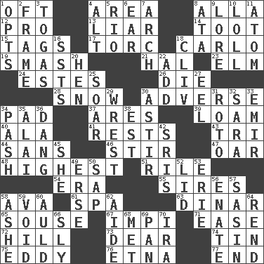 ACROSS 1. Often (poetically) 4. Type of rug 8. Silent film actress Nazimova 12. Adept person 13. One who doesn't tell the truth 14. A blast of a horn 15. Labels 17. Torque (variant) 18. Monte _, Las Vegas Hotel/Casino 19. Box-office sellout 21. Actor Linden 23. Shade tree 24. _____ Park, CO 26. Expire 28. Overwhelm 30. Contrary to your interests or welfare 34. Writing tablet 37. Ancient Greek god of war 39. Rich soil 40. Wing 41. Musical pauses 43. Three (prefix) 44. Without 46. Use a swizzle stick 47. Boat paddle 48. Having the greatest elevation 51. Cause heat under the collar 54. Epoch 55. Begets 58. Actress Gardner 61. Health resort 63. Middle Eastern gold or silver currency 65. Boozer 67. Body of Kaffir warriors 71. Relaxation 72. Land elevation 73. Letter starter 74. Metal container 75. Whirlpool 76. Inactive volcano in Sicily 77. Conclude DOWN 1. Elects 2. Movie unit 3. Ancient Roman robes 4. The first octave above the treble staff 5. River (Sp.) 6. Ewer handle 7. Bowlike part 8. "One Day ___ Time" 9. Old wives' tales, e.g. 10. Hang loosely or laxly 11. Smallest unit of an element 16. Fast planes 18. 154 in Roman numerals 20. Layer 22. Find the sum of 25. Fly high 27. Snakelike fish 29. Obtain by seizing forcibly or violently 30. Moving or stirring 31. Printing process, for short 32. "Two Mules for Sister ____" 33. Arab leader 34. Romantic infatuation 35. Mountain range southwest of Kyrgyzstan 36. Mild oath, euphamism for damn 38. Eastern Standard Time (abbr.) 42. Indian titles of respect 45. A female animal or person 49. Celtic language 50. Plant excrement 52. Hat (slang) 53. One of the Great Lakes 56. Related on the mother's side 57. Indian antelope 58. American tennis player Robert 59. State of nonexistence 60. Old (Scot.) 62. Assistant 64. Tear apart 66. Insidious 68. Was introduced to 69. Baking dish 70. Lyricist Gershwin