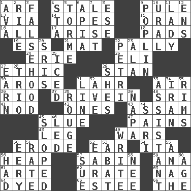 ACROSS 1. Sandy's bark 4. Showing deterioration from age 9. Whimper 13. By way of 14. Drinks excessively 15. NW Algerian seaport 16. Everything 17. Get up 18. Groovy apts. 19. Curvy letter 21. Floor protector 22. Friendly 24. 4th largest of the Great Lakes 26. Connecticut Ivy Leaguer 27. Principle of right and wrong 29. Comedian Laurel of Laurel & Hardy 30. Came up 31. Cowardly lion portrayer 33. Atmosphere 36. _ de Janeiro 37. Popular '50s hangout 40. Indian title of respect (Mr.) 41. Lower and raise head in agreement 42. Washington bills 43. Indian state 45. Change direction abruptly 47. Aches 48. Part of a journey 49. Armed conflicts 50. Wear away 52. Hearing organ 54. Call ___ day 56. Pile 57. Unit of acoustic absorption 59. Wet nurse (var.) 61. Johnson of "Laugh-In" 62. A salt of uric acid 63. Tired old horse 64. Colored 65. First name in cosmetics 66. Definite Article DOWN 1. Actress Gardner 2. Cause heat under the collar 3. It jiggles the polygraph 4. R.R. building 5. Singer Mel 6. Capital of Western Samoa 7. For fear that 8. Compass dir. 9. Cotton for raincoats, e.g. 10. Mountain range 11. Kenny Rogers chart-topper in '80 12. Followers of ems 20. Indian titles of respect 22. _ dish (used to culture cells) 23. In the manner of 25. On the rocks 27. Merit 28. Musical group of three 29. "______ My Girl" (Turtles hit) 31. Actor's bit 32. "___ Maria" 33. Helper 34. SW Asia republic 35. Basketball hoops 38. Makeup applied to the cheeks 39. California wine valley 44. Indian skirt 45. Inclined 46. Directed 49. Compose 50. Suggestive of the supernatural 51. Pace 52. Hearing organs 53. Blind as ____ 55. Housemaid 56. Possessed 57. Institute legal proceedings 58. Born 60. Personal question