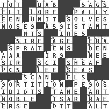 ACROSS 1. Small child 4. Pat or tap gently 7. Sinks 11. Connecticut Ivy Leaguer 12. Old wives' tales, e.g. 13. Friendly 14. Car or cant ending 15. A single undivided whole 16. Finds the solution 17. Olfactory organs 19. Aide 21. Mountains (abbr.) 23. Angers 24. Father 25. Grow older 26. Epoch 29. Small fatty European fish 30. Followers of ems 31. Lair 32. American Automobile Association (abbr.) 33. Big collection agency 34. Born 35. Title for a knight 36. _-fi 37. Bundle of cut stalks of grain 40. Personal Computers (abbr.) 41. Area sheltered from the wind 42. Oceans 43. Skim 45. Raised railways 46. Conclusion 51. Mexican monetary units 55. Foolish or stupid persons 56. Docile 58. Tate display 59. Having high moral qualities 60. Russian ruler of old 61. Actress Charlotte 62. Celtic language 63. Baseball player Mel 64. The first octave above the treble staff DOWN 1. Adolescent 2. Butter sub 3. Metal containers 4. Spanish title 5. Roberta Peters solo 6. Stakes 7. Table seasonings 8. Inventor's middle name 9. Small, secluded valley 10. System (abbr.) 12. A period of five years 13. Airs 16. Fathers 18. Independent ruler or chieftain 20. Signals 22. Put into a specified state 24. Practice fights 25. Nest on high 26. Ferber et al. 27. Coral ridge 28. A saturated hydrocarbon 29. Ketch in the Levant 32. Cleo's killer 33. Ancient Celtic tribe of eastern Britain 36. Narrow boards 37. Compass dir. 38. Aide 39. Relaxation 43. Fur scarf 44. Quote 46. Trig term 47. Scent 48. Teases 49. Von Bismarck 50. Political cartoonist Thomas 52. "Two Mules for Sister ____" 53. Spoken 54. Proofreading order 57. Floor covering