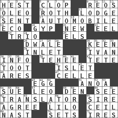 ACROSS 1. Command 5. Hoof sound 9. Vintage cars 13. Butter sub 14. Writer of Portnoy's Complaint (1969) 15. Cabin 16. Posted 17. Form of transportation 19. Environmental prefix 20. Con 21. ___ Haven, CT 22. Snakelike fish 23. Musical group of three 25. Raised railways 26. A sleeping potion; an opiate (poet.) 30. Peachy ____! 34. An arm off of a larger body of water 35. _ the terrible 36. Information 39. Giggle 42. False hair 43. A blast of a horn 44. Small island 46. Ancient Greek god of war 47. Cell (Danish) 48. Ovum 51. Small Philippine buffalo 54. Take to court 57. Lion 58. Lair 60. Perceive with the eye 62. Interpreter 65. Title for a man of rank and authority 66. Match 67. _ and Stitch 68. To provide with a ceiling 69. Political cartoonist Thomas 70. Puts into a specified state 71. Angers DOWN 1. Flexible conduit 2. Choose 3. Sir (Sp.) 4. Small child 5. Supercomputer manufacturer 6. Central Nebraska county 7. Baseball player Mel 8. Give a jingle 9. Director Reiner 10. Singer Brickell 11. Stare at amorously 12. Sew up the eyelids of hawks and falcons 15. Moos 18. Cartoonist voice _ Blanc 20. Woman's formal wear 24. Foolish or stupid persons 27. The first octave above the treble staff 28. Area sheltered from the wind 29. Moral principle 30. Baby cat 31. First lady 32. Consume 33. Compass dir. 36. Call ___ day 37. Not either 38. Enemy 40. Compass dir. 41. Pipe bend 45. Flair 48. Otherwise 49. Set 50. Scores awarded for successful feats 52. Flexible twig of a willow tree 53. Nest on high 54. Comedian Laurel of Laurel & Hardy 55. Capital and largest city of Mongolia 56. Hearing organs 58. Dunce 59. Greek god of love 61. Snakelike fish 63. Fish or hair follower 64. Neckwear 65. _-fi