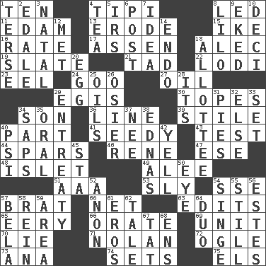 ACROSS 1. Nine, plus one 4. Native american tent (variation) 8. Directed 11. Dutch treat 13. Wear away 15. Eisenhower's nickname 16. Pace 17. NE Netherlands city 18. Actor Baldwin 19. Chalkboard 21. Small amount or degree 22. Farming town in central California 23. Snakelike fish 24. Thick or sticky substance 27. Petroleum 29. Armor plate that protects the chest 30. Drinks excessively 34. Manchild 36. Actor's bit 39. Vertical member of a panel or frame 40. Role in a play 41. Shabby and untidy 43. Trial 44. Practice fights 46. French philosopher Descartes 47. Compass dir. 48. Small island 49. Toward shelter 51. American Automobile Association (abbr.) 53. Mischievous 54. Compass dir. 57. Naughty child 60. Remaining after all deductions 63. Prepares for publication 65. Suggestive of the supernatural 66. Declaim 69. A single undivided whole 70. Whopper 71. Pitcher Ryan 72. Stare 73. Santa ___, CA 74. Arranges properly for use 75. Raised railways DOWN 1. Laconic 2. Peak District village in England 3. Brizilian seaport 4. Beverage made from leaves 5. Big collection agency 6. Mail 7. It may be bright or harebrained 8. _ and Stitch 9. Supplemented with great effort 10. Tenth: prefix 12. Was introduced to 14. Inside; within (prefix) 18. One to whom something is allotted 20. Oval reproductive body of a fowl 25. Lubricates 26. Flexible twig of a willow tree 28. ___ a Wonderful Life 29. Plea 31. Sliced desserts 32. Otherwise 33. Put into a specified state 34. Plant excrements 35. Taken by mouth 37. Born 38. Ferber et al. 40. Air pressure measure (abbr.) 42. Shout 45. R.R. building 50. Sight organ 52. At once, immediately (arch.) 54. Scorch 55. Free of sound 56. _____ Park, CO 57. Actor Lugosi 58. It's straight from the horse's mouth 59. Type of rug 61. Greek god of love 62. Falsehood 64. Superhero pair 67. Make lace 68. Followers of ems