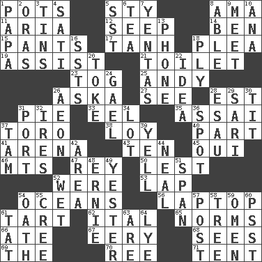 ACROSS 1. Cooking vessels 5. Filthy place 8. Nursemaid (var.) 11. Roberta Peters solo 12. Ooze 14. Benjamin's nick name 15. Leg coverings 17. Hyperbolic tangent 18. Entreaty 19. Aid 21. Bathroom plumbing fixture 23. Coat; cloak 25. Actor Griffith 26. "____ silly question..." 27. Observe 28. Eastern Standard Time (abbr.) 31. Sliced dessert 33. Snakelike fish 35. Slender Brazilian palm 37. "Corrida" creature 38. Myrna of the movies 40. Role in a play 41. Sports stadium 43. "___ Little Indians" 45. Fr. "Yes" 46. Mountains (abbr.) 47. Marina Del _, California 50. For fear that 52. We are 53. Pet locale 54. Seas 56. Portable computer 61. Small pie 62. Slanted text style (abbr.) 65. Typical models 66. Had dinner 67. Suggestive of the supernatural 68. Observes 69. Definite Article 70. To separate or throw off 71. Portable shelter DOWN 1. Dad 2. Mouths or openings 3. Airtight sealed metal containers 4. Suttee (variant) 5. Fast jet (abbr.) 6. Afternoon social gathering 7. Gossips 8. Competent 9. Rendezvous 10. Santa ___, CA 13. Give a jingle 16. Fast planes 18. Strand of rope, yarn or thread 20. Casino tip 22. The main thing one is thinking about 24. Highlander 26. A really long time 28. He sold his birthright 29. Indian skirt 30. Teat (slang) 31. Left side of a ship or aircraft 32. Angers 34. Car dealer's back yard 36. Blemish 37. Scottish cap 39. Shout 42. Length times width 44. Be tempered by heat 48. Bert's buddy 49. Of or pertaining to yesterday 51. Connect, as a bridge 52. Soggy 54. Pledge 55. Algonquian 57. Mail 58. Woody plant 59. Sign of something about to happen 60. Inconspicuous attention getter 61. Make lace 63. "We ___ not amused" (Victoria) 64. Potassium hydroxide
