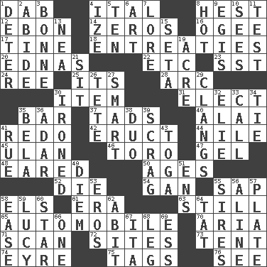 ACROSS 1. Pat or tap gently 4. Slanted text style (abbr.) 8. Behest 12. Inky black, to poets 14. Nothings 16. Double curve, resembling the letter S 17. Prong on a fork 18. Pleas 20. Ferber et al. 22. And so on (abbr.) 23. Fast jet (abbr.) 24. To riddle 25. ___ a Wonderful Life 28. Curve 30. A distinct part 31. Opt 35. Tavern 37. Bits 40. Mountain range southwest of Kyrgyzstan 41. Make new 42. Spew [out] 44. The longest river in the world 45. Uhlan (variant) 46. "Corrida" creature 47. Set 48. Having ears or earlike features 50. Eons 52. Pass on 54. Separate the seeds from cotton 55. Plant excrement 58. Raised railways 61. Period 63. Free from disturbance or agitation 65. Form of transportation 70. Operatic vocal solo 71. Glance over 72. Settings 73. Portable shelter 74. Jane of fiction 75. Labels 76. Observe DOWN 1. Prevent from occurring 2. Stay 3. Maid-servant 4. Ending with capital 5. "___ Little Indians" 6. Tate display 7. Old wives' tales, e.g. 8. Being at a high temperature 9. The front part of a cuirass 10. Observes 11. Trial 13. Teachers' org. 15. Stalk of a moss capsule 19. Measure of real estate 21. Be seated 26. False hair 27. Don Adams' spy role 29. Rings loudly 30. Pressed 32. Writer Wiesel 33. Give a ring to 34. Make a knot 35. Actor Lugosi 36. The sixth month of the Jewish calendar 38. Superhero pair 39. Strangle with an iron collar 41. Regret 43. Ancient Roman robe 49. South Vietnam president (1954) 51. Followers of ems 53. Greek god of love 55. Founders of families 56. Place in a line 57. Food holder 58. Relaxation 59. "I Love _" 60. Play the lead 62. "This won't hurt ____!" 64. Make lace 66. Single 67. Call ___ day 68. Part of a journey 69. Double-curved letter