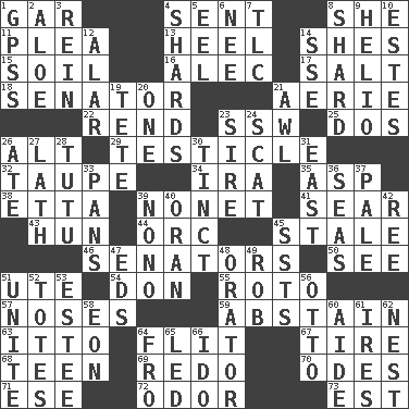 ACROSS 1. Slender fish 4. Posted 8. A female animal or person 11. Entreaty 13. Person who is morally reprehensible 14. "______ My Girl" (Turtles hit) 15. Land 16. Actor Baldwin 17. Table seasoning 18. Elected representative 21. Nest on high 22. Tear apart 23. Compass dir. 25. Two (Sp.) 26. The first octave above the treble staff 29. A testis 32. Grayish beige 34. Retirement account (abbr.) 35. Cleo's killer 38. Singer James 39. Music written for nine 41. Burn superficially 43. Attila the _ 44. The grampus (Milton) 45. Lacking originality or spontaneity 46. Legislators 50. Observe 51. Shoshoni 54. Spanish title 55. Printing process, for short 57. Olfactory organs 59. Choose not to consume 63. "Tell ____ the Marines!" 64. Sudden quick movement 67. Become fatigued 68. Adolescent 69. Do over again 70. Lyric poems 71. Compass dir. 72. Scent 73. Eastern Standard Time (abbr.) DOWN 1. Global Positioning Systems (abbr.) 2. Medicinal plant 3. It's straight from the horse's mouth 4. Broken pieces 5. Snakelike fish 6. Born 7. Affectionate concern, for short 8. Broken piece 9. Sun: prefix 10. _____ Park, CO 12. Having or resembling wings 14. Compass dir. 19. Wig 20. Single 21. Leather borer 23. Beget 24. Scram, to a cat 26. Had dinner 27. Thin strip of wood or metal 28. Ballerina skirt 30. Colored lightly or faintly 31. Compass direction 33. Baking dishes 36. Oceans 37. Diluted with white 39. Words to Nanette 40. Northwest Algerian city 42. To riddle 45. Fast planes 47. Begley and Asner 48. Speaker 49. Director Reiner 51. Join together 52. Lugs 53. First name in cosmetics 56. Von Bismarck 58. Period of immesurable duration 60. Assistant 61. Angers 62. A home for chicks 64. Away 65. Directed 66. Wedding promise