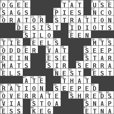 ACROSS 1. Double curve, resembling the letter S 5. Make lace 8. Purpose 11. Droops 12. Sliced desserts 13. Non-commissioned officer (abbr.) 14. Speaker 17. Ski resort town in Vermont 19. Stop 21. Foolish or stupid persons 22. Grain storage tower 23. Car or cant ending 24. Neckwear 27. Snakelike fish 29. Mountains (abbr.) 32. More peculiar 34. Large container 36. Ooze 37. It's straight from the horse's mouth 38. Compass dir. 39. Play the lead 40. Floor coverings 41. Title for a knight 42. Spanish missionary in California 43. Raised railways 44. A home for chicks 46. Eastern Standard Time (abbr.) 47. Had dinner 50. Not this but _ 52. Food allowance for one day 55. Oozed 57. Make much ado about nothing 59. Tears up 62. By way of 63. Portico 64. Fastener 65. Curvy letter 66. Barrel 67. Inactive volcano in Sicily DOWN 1. Bear (Spanish) 2. Slender fish 3. Mild oath 4. _____ Park, CO 5. Teat (slang) 6. Nest on high 7. Sadhe (variant) 8. To (old English) 9. Native of Scotland 10. Immeasurably long periods of time 12. Pacific Standard Time (abbr.) 15. Flexible twig of a willow tree 16. Cause heat under the collar 18. Shallow baking pan 20. Finds the solution 24. Singer Mel 25. Perfect 26. Proofreads 28. Indian antelope 29. Distance measurement (Brit.) 30. Lacerates 31. Small fatty European fish 33. Followers of ems 35. Cylindrical with tapered ends 36. Compass dir. 42. Staphylococcus 45. "______ My Girl" (Turtles hit) 47. Wind 48. Cod relative 49. Related on the mother's side 51. Laconic 52. Be footloose 53. Deliberation 54. Afternoon social gatherings 55. Ocean 56. Undesirable depression on a surface 58. Coat; cloak 60. One of the 12 tribes of Israel 61. Health resort