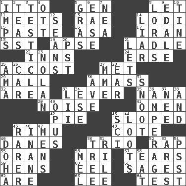 ACROSS 1. "Tell ____ the Marines!" 5. Commissioned mil. rank 8. Allow 11. Confronts 13. Actress Charlotte 14. Farming town in central California 15. Thick mixture 16. White ___ sheet 17. SW Asia republic 18. Fast jet (abbr.) 19. Domed church section 21. Dipping utensil 22. Taverns 24. Celtic language 25. Buttonhole 27. Was introduced to 29. Shopping center 30. Collect or gather 32. Type of rug 33. Crowbar 35. Nanny 39. Annoying sound 41. Sign of something about to happen 42. Sliced dessert 43. Had an oblique or slanted direction 45. Tall New Zealand timber tree 48. ____ d'Azur (French Riviera) 49. Natives or inhabitants of Denmark 50. Musical group of three 52. Hit sharply and swiftly 55. Northwest Algerian city 56. Medical imaging device (abbr.) 57. Separates forcefully 59. Coop moms 60. Snakelike fish 61. Gurus 62. "We ___ not amused" (Victoria) 63. Area sheltered from the wind 64. Trial DOWN 1. Naughty children 2. Beverages made from leaves 3. A testis 4. Baseball player Mel 5. Pate de foie ____ 6. Relaxation 7. Teachers' org. 8. Nobles 9. Peak District village in England 10. Prong on a fork 12. Actors Connery and Penn 14. One who doesn't tell the truth 20. Pacific Standard Time (abbr.) 21. Allows 23. Pitcher Ryan 25. Nanny (var.) 26. 4-wheeled motor vehicle 27. Madame (abbr.) 28. Ewer handle 30. "___ Maria" 31. Snout, nose 33. Cards in a Roman deck? 34. Compass dir. 36. Electrical Measurement 37. Born 38. Also 40. Musical composition 43. _-fi 44. Plunders 45. More uncommon 46. Silly 47. Not women's 49. Capital of the state of Qatar 50. Relationship diagram 51. Cause heat under the collar 53. Ancient Greek god of war 54. Inconspicuous attention getter 56. Cartoonist voice _ Blanc 58. Erode