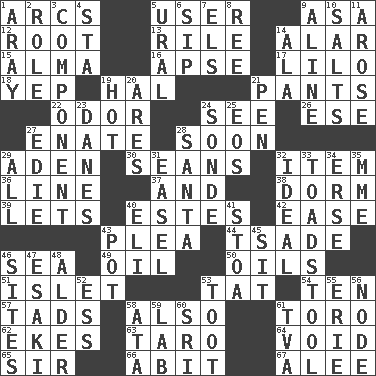 ACROSS 1. Arches 5. One who makes use of a thing 9. White ___ sheet 12. Carrot, for example 13. Cause heat under the collar 14. Having or resembling wings 15. _ mater 16. Domed church section 17. _ and Stitch 18. Slangy assent 19. Actor Linden 21. Leg coverings 22. Scent 24. Observe 26. Compass dir. 27. Related on the mother's side 28. Within a short period 29. An important port of Yemen 30. Actors Connery and Penn 32. Detail 36. Actor's bit 37. Plus 38. Dormintory (informal) 39. Allows 40. _____ Park, CO 42. Comfort 43. Entreaty 44. Sadhe (variant) 46. Ocean 49. Petroleum 50. Petroleums 51. Small island 53. Make lace 54. Nine, plus one 57. Small boys 58. In addition 61. "Corrida" creature 62. Makes supply last 63. Pacific island yam 64. Null 65. Title for a knight 66. "This won't hurt ____!" 67. Toward shelter DOWN 1. Like ___ of sunshine 2. Hero or heavy, e.g. 3. Piece 4. R.R. building 5. Mountain range 6. Small drink 7. Raised railways 8. To sift 9. Place in a line 10. Table seasonings 11. Came up 14. Chicken ___ king 19. Being at a high temperature 20. Ancient Greek god of war 21. Animal enclosure 23. Natives or inhabitants of Denmark 24. Something which is sent 25. Greek goddess of the dawn 27. Singer Brickell 28. Before Barbara or Clara 29. Everything 31. Artist's stand 32. Standard of perfection 33. Inedible or poisonous agaric 34. Celtic language 35. Madame (abbr.) 40. Biblical high priest 41. Portico 43. Plant holder 45. Be seated 46. Settings 47. 1973 Nobel Price Winner (Physics) Leo 48. Tree or shrub in the Birch family 52. Double-curved letter 53. A blast of a horn 55. One of the Great Lakes 56. Connecting point 58. "One Day ___ Time" 59. Experiment locale 60. Indian title of respect (Mr.) 61. Federal power corp.