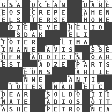 ACROSS 1. Girls' org. (abbr.) 4. Sea 9. Have the gumption 13. Greek goddess of the dawn 14. Streamer paper 15. So be it 16. Raised railways 17. Laconic 18. Dwelling 19. Pass on 21. Sight organ 22. Sun: prefix 24. Neighbor of Neb. 26. Biblical high priest 27. Carrier 29. Pale green bean 30. Empty; void 31. Deliberation 33. Compass dir. 36. Lair 37. Inveterate users 40. Rowing implement 41. Eastern Standard Time (abbr.) 42. Axlike tool, used for shaping wood 43. Pieces 45. Immeasurably long periods of time 47. Nick name for Arthur 48. Compass dir. 49. Opposed to 50. Lugs 52. Spoil 54. And so on (abbr.) 56. Letter starter 57. Twentieth part of a lira 59. One more than two 61. Nathan's nickname 62. Goodbye (Sp.) 63. Baseball player Mel 64. American tennis player Robert 65. Stone: prefix 66. Teachers' org. DOWN 1. Turn to the right 2. Disposed of to a purchaser 3. Helper 4. Sep. follower 5. Small stream 6. Suggestive of the supernatural 7. Domed church section 8. Born 9. Mexican or Central American flower 10. Mine, in Marseilles 11. San ____ (Riviera town) 12. Compass dir. 20. Locale of original sin 22. Robbery 23. Shade tree 25. Length times width 27. Periodic rise and fall of the sea level 28. Washington bills 29. Louse (plural) 31. Sums up 32. Namely 33. Decision 34. Suttee (variant) 35. Celtic language 38. Natives or inhabitants of Denmark 39. Connect, as a bridge 44. Johnson of "Laugh-In" 45. Main course 46. Single 49. Zeal 50. Afternoon social gatherings 51. Pledge 52. Method 53. Set down 55. Quote 56. Heredity factor (abbr.) 57. Plant excrement 58. Bear (Spanish) 60. Call ___ day