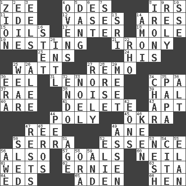 ACROSS 1. Last letter of the English alphabet 4. Lyric poems 8. Big collection agency 11. Binary compound 12. Flower holders 14. Ancient Greek god of war 15. Lubricates 17. Keyboard key 18. Undercover agent 19. Inhabiting a nest 21. Literary sarcasm 23. Followers of ems 24. Part of HMS, perhaps 25. Electrical Unit 27. San ____ (Riviera town) 30. Snakelike fish 31. Poe poem 34. Numbers guy (abbr.) 37. Actress Charlotte 38. Annoying sound 39. Actor Linden 40. "We ___ not amused" (Victoria) 41. Keyboard key 43. Fitting 44. More than one (prefix) 45. Gumbo ingredient 47. Portuguese money of account (variant) 49. One (Scot) 50. Father Junipero _ 52. Core 56. In addition 57. Purposes of endeavors 60. Famous astronaut Armstrong 61. Soaks 62. Bert's buddy 63. R.R. building 64. Begley and Asner 65. Arabian gulf 66. Layer DOWN 1. The Jewish people; Israel 2. Singer Brickell 3. Snakelike fish 4. Baking chambers 5. Mild oath, euphamism for damn 6. Eastern Standard Time (abbr.) 7. Perceive with the eye 8. Removes the wrinkles 9. Depend 10. Compass dir. 13. Indian title of respect (Mr.) 14. Mine, in Marseilles 16. Proofreading order 20. International (abbr.) 22. 17th letter of the Greek alphabet 25. Put on (as clothing) 26. Toward shelter 27. Turbulent 28. Celtic language 29. Confront 30. Epoch 32. Inside; within (prefix) 33. Christmas carol 34. Burn to charcoal 35. Dad 36. The first octave above the treble staff 42. Immeasurably long periods of time 44. For each 46. Peachy ____! 47. Musical pauses 48. Greek god of love 49. NE Netherlands city 50. Downhill vehicle 51. Grow older 52. Writer Wiesel 53. Soft 54. Quote 55. Liveliness 56. Deep reverence 58. Mouth or opening 59. Also