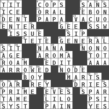 ACROSS 1. Teat (slang) 4. 911 reaches them 8. Without 12. Frozen water 13. Taken by mouth 14. Inky black, to poets 15. Undesirable depression on a surface 17. Dad 18. In a vacuum (with "in") 19. Keyboard key 21. Turn to the right 23. Compass dir. 24. Come out of 26. Small drink 28. Wig 30. Commissioned military rank 34. Be seated 37. Grandmother 39. Words to Nanette 40. Mature 41. Odor 43. Small child 44. Wander 46. Prepare for publication 47. American Automobile Association (abbr.) 48. Moved like an arrow 51. Connecting point 54. Male child 55. Shops 58. Boat paddle 61. Marina Del _, California 63. Frees from moisture 65. A-one 67. Nights before holidays 71. Coast Guard woman 72. Not wild 73. _ and Stitch 74. Air pressure measure (abbr.) 75. System (abbr.) 76. Ache 77. Consenting reply DOWN 1. Event that recurs at intervals 2. Ancient Celtic tribe of eastern Britain 3. Portable shelters 4. Police officer (slang) 5. Mouth or opening 6. Infant food 7. Volcanic refuse 8. Ocean 9. Lettered men learn these first 10. Good sense 11. Overwhelm 16. Trial 18. Distinctive style or manner 20. Sorrow 22. Compass dir. 25. Inactive volcano in Sicily 27. Animal enclosure 29. Having ears or earlike features 30. Homeless child 31. Roll call or roster of names 32. Small Philippine buffalo 33. Globular water bottle used in Asia 34. "Two Mules for Sister ____" 35. Composer Stravinsky 36. Rend 38. Dreamland 42. Tiny particle 45. Crowd into 49. Had on 50. Sight organ 52. June honoree 53. Blunders 56. Likely to tip or tilt 57. Gospel singer Marvin 58. Chooses 59. Like ___ of sunshine 60. Basketball hoops 62. Sharp bark 64. Indian titles of respect 66. Was introduced to 68. By way of 69. Connecticut Ivy Leaguer 70. Boy, to dad