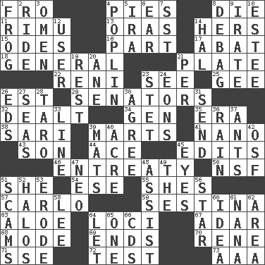 ACROSS 1. From 4. Sliced desserts 8. Pass on 11. Tall New Zealand timber tree 13. Mouths or openings 14. Possessive pronoun 15. Lyric poems 16. Role in a play 17. Blind as ____ 18. Commissioned military rank 21. Food holder 22. Painter Guido (1575-1642) 23. Observe 25. Turn to the right 26. Eastern Standard Time (abbr.) 29. Legislators 32. Started a card game 34. Commissioned military rank (abbr.) 35. Period 38. Indian skirt 39. Shops 41. Billionth: prefix 43. Male offspring 44. Adept person 45. Proofreads 46. Plea 50. Overdraft (abbr.) 51. A female animal or person 54. Compass dir. 55. "______ My Girl" (Turtles hit) 57. Monte _, Las Vegas Hotel/Casino 59. French poetic form 63. Medicinal plant 64. Venues 67. The sixth month of the Jewish calendar 68. Method 69. Extremities 70. French philosopher Descartes 71. Compass dir. 72. Trial 73. Auto club (abbr.) DOWN 1. Tree-dwelling hopper 2. Travel on an animal 3. Presage 4. Cotton for raincoats, e.g. 5. Retirement account (abbr.) 6. Ewer handle 7. Fast jet (abbr.) 8. Debunk (Brit. slang) 9. Feeling or showing extreme anger 10. First name in cosmetics 12. One who uses or employs something 14. Actor Linden 19. Repose 20. One (Scot) 21. For each 23. Proofreading order 24. Immeasurably long periods of time 26. Begley and Asner 27. Oceans 28. Pacific island yam 30. Match 31. Post 33. Actor's bit 36. Water falling in drops from the sky 37. Pismires 39. Floor coverings 40. 1/640 square mile 42. Order of Saint Francis (abbr.) 45. Snake ____ (dice throw) 47. Modern: prefix 48. Aid 49. Definite Article 51. Fraudulent business schemes 52. Auras 53. Wear away 56. Play the lead 58. Area sheltered from the wind 60. The content of cognition 61. Grandmother 62. Length times width 64. Allow 65. Single 66. Music discs