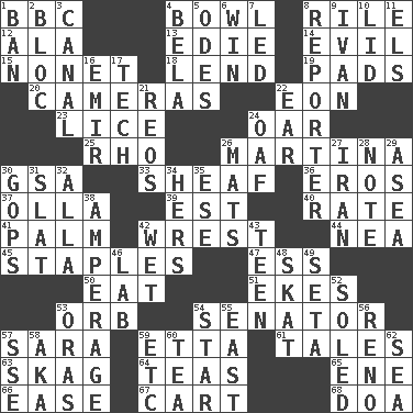 ACROSS 1. English channel? 4. Soup holder 8. Cause heat under the collar 12. According to 13. Singer Brickell 14. Morally bad or wrong 15. Music written for nine 18. Grant temporary use of 19. Groovy apts. 20. Devices for capturing images 22. Period of immesurable duration 23. Louse (plural) 24. Boat paddle 25. 17th letter of the Greek alphabet 26. Chrissie's court nemesis 30. Girls' org. (abbr.) 33. Archer's quiver 36. Greek god of love 37. Spanish pot 39. Eastern Standard Time (abbr.) 40. Assign a rank or rating to 41. Inside of hand 42. Take or capture by force 44. Teachers' org. 45. Paper fasteners 47. Curvy letter 50. Erode 51. Supplements with great effort 53. Globe 54. Legislator 57. "Two Mules for Sister ____" 59. Singer James 61. Falsehoods 63. Heroin 64. Afternoon social gatherings 65. Compass dir. 66. Relaxation 67. Haul 68. ___ good deed DOWN 1. Bar 2. Alliance 3. Lessep's creation 4. Actor Lugosi 5. Lyric poems 6. Acquire through effort 7. Directed 8. News announcer 9. _ the terrible 10. Flaplike covering 11. Raised railways 16. Independent ruler or chieftain 17. Georgia ____ (Atlanta school) 21. Vintage cars 22. Ewer handle 24. Clumsy lout 26. Floor coverings 27. SW Asia republic 28. Musical sound 29. At sea 30. Republicans 31. Narrow board 32. Silent film actress Nazimova 34. Possessive pronoun 35. Compass dir. 38. Electrical Measurement 42. Soggy 43. Adolescent 46. Experiment locale 48. Three-handed card game 49. Bristle 52. Having a sole or soles 53. Mouths or openings 54. Play the lead 55. 90 degrees 56. Western Nevada city 57. Compass dir. 58. Alias (abbr.) 59. And so on (abbr.) 60. Afternoon social gathering 62. Ocean