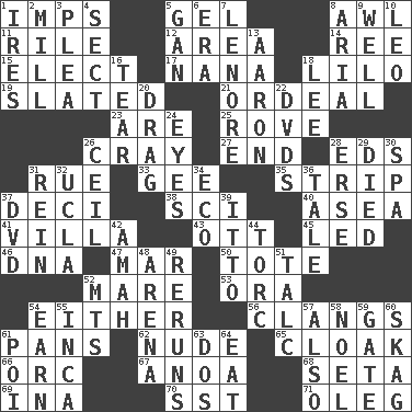 ACROSS 1. Naughty children 5. Set 8. Leather borer 11. Cause heat under the collar 12. Length times width 14. To riddle 15. Choose 17. Grandmother 18. _ and Stitch 19. Scheduled 21. Severe or trying experience 23. "We ___ not amused" (Victoria) 25. Be footloose 26. Supercomputer manufacturer 27. Conclude 28. Begley and Asner 31. Sorrow 33. Turn to the right 35. Remove all contents or possession from 37. Tenth: prefix 38. _-fi 40. Toward the sea 41. Country residence 43. Baseball player Mel 45. Directed 46. Heredity factor (abbr.) 47. Spoil 50. Lug 52. Female horse 53. Mouth or opening 54. One or the other 56. Rings like a ship's bell 61. Zero-star reviews 62. Unadorned 65. Covering 66. The grampus (Milton) 67. Small Philippine buffalo 68. Stalk of a moss capsule 69. _ tizzy (2 wds.) 70. Fast jet (abbr.) 71. Cassini of fashion DOWN 1. Angers 2. Place where flour is made 3. Entreaty 4. Religious group 5. Separate the seeds from cotton 6. Epoch 7. Poe poem 8. Roberta Peters solo 9. Not ill 10. Lion 13. Composer Copland 16. Pull into pieces 18. Area sheltered from the wind 20. To draw with force 22. Movie discs 24. Sight organs 26. To provide with a ceiling 28. Celtic language 29. Passed on 30. Health resort 31. It's straight from the horse's mouth 32. Southern CA. univ. 34. Environmental prefix 36. Story 37. Movie disc 39. "Tell ____ the Marines!" 42. Housemaid 44. Torque (variant) 48. Sports stadium 49. Summer TV shows 51. Baby powder 52. Mountains (abbr.) 54. Merit 55. South American Indian 57. In addition 58. Christmas carol 59. Yard entry 60. Heroin 61. Luau course 63. Two (Sp.) 64. Erode