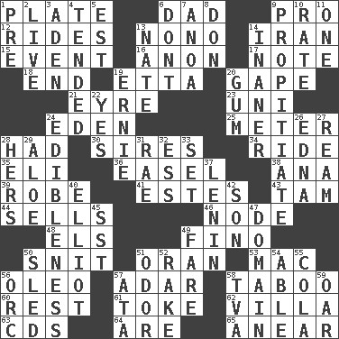 ACROSS 1. Food holder 6. June honoree 9. Adept person 12. Amusement-park features 13. Words to Nanette 14. SW Asia republic 15. Incident 16. At once, immediately (arch.) 17. Brief written record 18. Conclusion 19. Singer James 20. Yawn 21. Jane of fiction 23. Corn or form start 24. Paradise 25. Distance measurement 28. Possessed 30. Begets 34. Travel on an animal 35. Connecticut Ivy Leaguer 36. Artist's stand 38. Santa ___, CA 39. Loose flowing garment 41. _____ Park, CO 43. Scottish cap 44. Exchanges for money 46. Thickened enlargement 48. Raised railways 49. Fine (Spanish) 50. In a ____ (agitated or irritated) 51. NW Algerian seaport 53. Big _ 56. Butter sub 57. The sixth month of the Jewish calendar 58. Off limits 60. Remainder 61. Puff or smoke 62. Country estate 63. Music discs 64. "We ___ not amused" (Victoria) 65. Approach DOWN 1. Before (prefix) 2. Moving, as bait 3. Arabian gulf 4. Watched over 5. Eastern Standard Time (abbr.) 6. Do not 7. Small Philippine buffalo 8. Spanish title 9. Appease 10. Assign a rank or rating to 11. Single 13. Nathan's nickname 14. Sillier 19. Bert's buddy 20. Chewing product 22. Affirmative reply 24. The property of being fit to eat 26. Pulitzer Prize-winning author Ferber 27. 480, 500 or 516 sheets of paper 28. Possessive pronoun 29. Medicinal plant 31. Actress Charlotte 32. Double-curved letter 33. Put into a specified state 37. Soviet premier 1918-24 40. American author Paul (1891-1958) 42. Male child 45. Fast jet (abbr.) 47. Kingdom 49. Conductor's collection 50. Downhill vehicle 51. Aroma 52. Immoral or dissolute person 54. Competent 55. Root beer relative 56. The grampus (Milton) 57. "One Day ___ Time" 58. Federal power corp. 59. Rowing implement