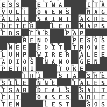 ACROSS 1. Curvy letter 4. Inactive volcano in Sicily 8. Call ___ day 11. Electrical Unit 13. Baking chambers 15. Tired old horse 16. Mountain range southwest of Kyrgyzstan 17. Inhabitant of Heaven 18. 1/640 square mile 19. Prevent from occurring 21. Lion 22. Atlas contents 23. Begley and Asner 24. Hearing organ 27. Infant food 29. Western Nevada city 30. Mexican monetary units 34. Born 36. Prepare for publication 39. Collection of objects 40. Mass 41. One who wires 43. Toward shelter 44. Goodbye (Sp.) 46. Billionth: prefix 47. Commissioned mil. rank 48. _ dish (used to culture cells) 49. Puff or smoke 51. Three (prefix) 53. R.R. building 54. A female animal or person 57. Filth; sediment 60. Compass dir. 63. Stories 65. Russian ruler of old 66. Allots cards 69. Table seasoning 70. Connecticut Ivy Leaguer 71. Fertile tracts in a desert 72. Competent 73. Nine, plus one 74. For fear that 75. Mayday DOWN 1. Elude 2. Having a sole or soles 3. Narrow boards 4. Greek goddess of the dawn 5. Federal power corp. 6. Famous astronaut Armstrong 7. Queen of England 1702-14 8. South American Indian 9. Canvas cover 10. Eras 12. Standoff 14. Constrict 18. Electrical Measurement 20. To sift 25. Afresh 26. "The Thinker" sculptor 28. Fitting 29. Newsperson 31. Flatfish 32. Baking chamber 33. Perceive with the eye 34. Unadorned 35. Send forth 37. Lyricist Gershwin 38. Portable shelters 40. Pet locale 42. Carrot, for example 45. Title for a knight 50. Krazy ___ of comics 52. Southeast Asian peninsula 54. Thick slices 55. Phone greeting 56. _____ Park, CO 57. Proofreading order 58. Small island 59. (Had) reclined 61. Be tempered by heat 62. Relaxation 64. White ___ sheet 67. French article 68. Fast jet (abbr.)