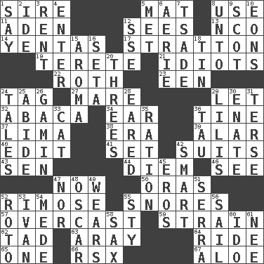 ACROSS 1. Beget 5. Floor covering 8. Purpose 11. Arabian gulf 12. Perceives with the eye 13. Non-commissioned officer (abbr.) 14. Gossips 17. Ski resort town in Vermont 19. Cylindrical with tapered ends 21. Foolish or stupid persons 22. Writer of Portnoy's Complaint (1969) 23. Car or cant ending 24. Label 27. Female horse 29. Allow 32. Phillipine bananalike plant 34. Ewer handle 36. Prong on a fork 37. Pale green bean 38. Period 39. Having or resembling wings 40. Prepare for publication 41. Put into a specified state 42. Sets of matching outer garments 43. Elected rep. 44. South Vietnam president (1954) 46. Perceive with the eye 47. At this time 50. Mouths or openings 52. Full of chinks, cracks, or crevices 55. Sounds asleep 57. Cloudy 59. Put through a sieve 62. Small boy 63. Like ___ of sunshine 64. Travel on an animal 65. Single 66. Acura sports coupe 67. Medicinal plant DOWN 1. Declare 2. Binary compound 3. Monthly bill 4. Keyboard key 5. Was introduced to 6. Nest on high 7. Sadhe (variant) 8. To (old English) 9. Native of Scotland 10. Immeasurably long periods of time 12. Compass dir. 15. Odor 16. Stalk of a moss capsule 18. Metal container 20. Triads 24. Stories 25. Tolerate 26. Homeless child 28. Having ears or earlike features 29. Ms. Damita and namesakes 30. Maternal 31. Laconic 33. Domesticated feline 35. Food allowance for one day 36. The 19th letter of the Greek alphabet 42. Don Adams' spy role 45. Greek god of love 47. And not 48. Witty Wilde 49. Erodes 51. Father Junipero _ 52. Printing process, for short 53. "Terrible" tsar 54. Ancient Persian 55. Filthy place 56. Move on water 58. Saxophone 60. Wedding promise 61. Born