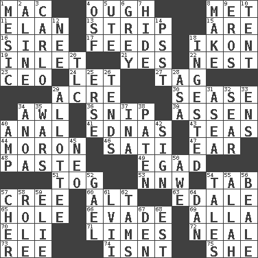 ACROSS 1. Big _ 4. Ending for "Through" and "Enough" 8. Was introduced to 11. Enthusiasm 13. Long narrow piece of something 15. "We ___ not amused" (Victoria) 16. The founder of a family 17. Eats 18. Picture 19. An arm off of a larger body of water 21. It is so 22. A home for chicks 23. Corporate head (abbr.) 24. Allow 27. Label 29. 43,560 square feet 30. Gospel singer Marvin 34. Leather borer 36. Sever or remove by pinching or nipping 39. NE Netherlands city 40. Of or related to the anus 41. Ferber et al. 43. Beverages made from leaves 44. Person of subnormal intelligence 46. Suttee (variant) 47. Hearing organ 48. Thick mixture 49. Mild oath 51. Coat; cloak 53. Compass dir. 54. Keyboard key 57. Algonquian 60. Keyboard modifier key 63. Peak District village in England 65. Hollow 66. Dodge 69. Silent film actress Nazimova 70. Connecticut Ivy Leaguer 71. Citrus fruits 72. Anneal 73. To sift 74. Is not 75. A female animal or person DOWN 1. Mesonic 2. Place in a line 3. Monte _, Las Vegas Hotel/Casino 4. Order of Saint Francis (abbr.) 5. Shoshoni 6. Jennifer or Joel 7. Flintstone garb 8. Cause to be 9. Greek god of love 10. Portable shelter 12. Born 14. Inconspicuous attention getter 18. Swallowed 20. Affectionate concern, for short 25. Celtic language 26. Watches over 28. White ___ sheet 29. One to whom something is allotted 31. At sea 32. Scorch 33. Followers of ems 34. Small Philippine buffalo 35. Armed conflicts 37. _ tizzy (2 wds.) 38. Eucharist need 40. Electrical Unit 42. Omen 45. Modern: prefix 50. Deep reverence 52. Highlander 54. Stories 55. Assad's deity 56. Memphis, Tenn. Street 57. "Mermaids" star 58. Hero or heavy, e.g. 59. Writer Wiesel 61. 57 in ancient Rome 62. Scottish caps 64. One of the 12 tribes of Israel 67. Lair 68. Eastern Standard Time (abbr.)