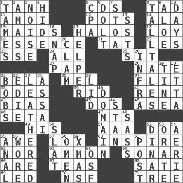 ACROSS 1. Hyperbolic tangent 5. Music discs 8. Bit 11. Mine, in Marseilles 12. Cooking vessels 14. Chicken ___ king 15. Women servants 17. Rings 18. Myrna of the movies 19. Substance 21. Make lace 22. French article 23. Compass dir. 24. 100% 25. Be seated 27. Infant food 28. Nathan's nickname 31. Actor Lugosi 35. Cartoonist voice _ Blanc 37. Secret move to avoid paying debts 38. Lyric poems 39. To free from 41. Monthly bill 42. Prejudice 43. Two (Sp.) 45. Toward the sea 46. Stalk of a moss capsule 47. Mountains (abbr.) 49. Part of HMS, perhaps 51. American Automobile Association (abbr.) 52. ___ good deed 55. Deep reverence 57. Brine-cured salmon 60. Heighten or intensify 62. And not 63. ID or VA city 65. Underwater navigation system 66. "We ___ not amused" (Victoria) 67. Beverages made from leaves 68. Suttee (variant) 69. Directed 70. Overdraft (abbr.) 71. Relationship diagram DOWN 1. Makes less strong or intense 2. Collect or gather 3. Annoying sound 4. Flintstone garb 5. Tax preparer (abbr.) 6. Stupid person 7. Portico 8. Baron Munchausen's specialties 9. Medicinal plant 10. 24-hour periods 13. Fast planes 16. Fastener 17. Assistant 20. Burrowing marine mollusk 26. Kind of red light 29. Prong on a fork 30. Singer James 31. Moves up and down 32. Singer Brickell 33. Resembling or made to resemble leather 34. Slender Brazilian palm 36. Hat (slang) 40. Kingdom 44. Comedian Laurel of Laurel & Hardy 48. Backtalk 50. Narrow board 52. Middle Eastern gold or silver currency 53. Declaim 54. Nest on high 55. Of or related to the anus 56. Had on 58. Sign of things to come 59. Dec. holiday 61. Mail 64. Order of Saint Francis (abbr.)