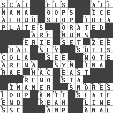 ACROSS 1. Leave at once 5. Raised railways 8. Small island 11. Grandmother 12. I made a mistake 14. Frozen water 15. Verbally 17. Cease 18. The main thing one is thinking about 19. Food holders 21. Declaimed 23. "We ___ not amused" (Victoria) 25. Religious women 26. One of the Great Lakes 27. Arrange properly for use 28. Last letter of the English alphabet 31. Actor Linden 33. Stealthy 35. Costumes for special activities 37. Root beer relative 38. Observe 40. Observe 41. Sports stadium 43. Symbol (abbr.) 45. _ tizzy (2 wds.) 46. Actress Charlotte 47. Big _ 50. Compass direction 52. Former U.S. Attorney General Janet 53. R.R. building 54. More empty; more void 56. Sounds asleep 61. Central Nebraska county 62. Against 65. Chalkboard 66. Conclude 67. 480, 500 or 516 sheets of paper 68. Actor's bit 69. Compass dir. 70. Electrical Unit 71. Of or related to the anus DOWN 1. Fastener 2. Give a ring to 3. Small Philippine buffalo 4. Pulled tight 5. Greek goddess of the dawn 6. Car dealer's back yard 7. Soup utensils 8. Helper 9. On the rocks 10. Afternoon social gathering 13. Upset 16. Letter starter 18. ___ a Wonderful Life 20. Indian titles of respect 22. Pismires 24. Snakelike fish 26. Flair 28. The Jewish people; Israel 29. Singer James 30. Compass dir. 31. Israeli folk dance 32. Toward shelter 34. It is so 36. A single undivided whole 37. 4-wheeled motor vehicle 39. Sight organs 42. So be it 44. Floor protectors 48. Approach 49. Pupil covering 51. Without 52. Reproach for some lapse or misdeed 54. Charged particles 55. Unadorned 57. Spanish pot 58. Water falling in drops from the sky 59. Inactive volcano in Sicily 60. Stitch closed the eyes of (a falcon) 61. French article 63. Scottish cap 64. Naughty child