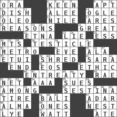 ACROSS 1. Mouth or opening 4. Peachy ____! 8. Fitting 11. Food container 13. Toward shelter 14. Stare at amorously 15. Butter sub 16. "Death on the ____" 17. Ancient Greek god of war 18. Thinks logically 21. Relatively large 22. Inactive volcano in Sicily 23. Untruth 25. Double-curved letter 26. Mountains (abbr.) 29. A testis 32. Paris' subway 34. Night before a holiday 35. In the manner of 38. Needle case 39. Tear up 41. "Two Mules for Sister ____" 43. Conclude 44. Greek goddess of the dawn 45. Moral principle 46. Plea 50. Actress Charlotte 51. Remaining after all deductions 54. Auto club (abbr.) 55. Takes to court 57. Amid 59. French poetic form 63. Become fatigued 64. Indonesian resort city 67. The sixth month of the Jewish calendar 68. _ mater 69. Washington bills 70. A home for chicks 71. Potassium hydroxide 72. Electrical Unit 73. Had dinner DOWN 1. Aroma 2. Cause heat under the collar 3. Toward the sea 4. Sunflower state 5. Biblical high priest 6. Snakelike fish 7. Born 8. Match 9. Entreaties 10. Trials 12. Stockings 14. Boat paddle 19. "Beetle Bailey" pooch 20. Compass dir. 21. Set 23. Not recorded 24. On the rocks 26. Madame (abbr.) 27. Wig 28. Surprise greatly 30. Laconic 31. Compass direction 33. Travel on or in a vehicle 36. Cowardly lion portrayer 37. Roberta Peters solo 39. Bristle 40. Israeli folk dance 42. Adept person 45. Snake ____ (dice throw) 47. Tired old horse 48. Help 49. Third day of the wk. 51. Relating to or accompanying birth 52. Poet Dickinson 53. Singer Mel 56. Comedian Laurel of Laurel & Hardy 58. Teachers' org. 60. The content of cognition 61. Political cartoonist Thomas 62. Johnson of "Laugh-In" 64. Ribbon knot 65. Santa ___, CA 66. Allow