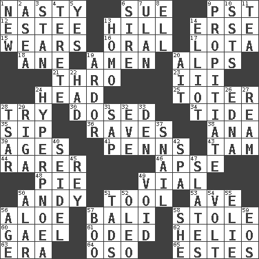 ACROSS 1. Difficult 6. Take to court 9. Pacific Standard Time (abbr.) 12. First name in cosmetics 13. Land elevation 14. Celtic language 15. Erodes 16. Spoken 17. Globular water bottle used in Asia 18. One (Scot) 19. So be it 20. High mountains 21. Through, poetically 23. One more than two 24. Froth on beer 25. Carrier 28. Attempt 30. Administered medicine 34. Periodic rise and fall of the sea level 35. Small drink 36. All-night dance parties 38. Santa ___, CA 39. Matures 41. Actor Sean's family 43. Scottish cap 44. Less widely known 46. Domed church section 48. Sliced dessert 49. Small bottle 50. Actor Griffith 51. Instrument 53. "___ Maria" 56. _ vera 57. Indonesian resort city 58. Fur scarf 60. Highlander 61. Wrote a lyric poem 62. Sun: prefix 63. Epoch 64. Bear (Spanish) 65. _____ Park, CO DOWN 1. ___ Haven, CT 2. Toward the sea 3. Comedian Laurel of Laurel & Hardy 4. Cylindrical with tapered ends 5. It is so 6. The founder of a family 7. ____ Bator 8. Pipe bend 9. Conciliate 10. Fast planes 11. Afternoon social gathering 13. Same (prefix) 14. American author Paul (1891-1958) 19. Zeal 20. Small island 22. Possessed 24. Abnormally rapid or deep breathing 26. Pulitzer Prize-winning author Ferber 27. 480, 500 or 516 sheets of paper 28. Russian ruler of old 29. Port city in Latvia 31. Plant excrement 32. First lady 33. Lair 37. Slow-paced one 40. Beer mug 42. Health resort 45. Marina Del _, California 47. Chalkboards 49. Null 50. Having or resembling wings 51. Small boys 52. Butter sub 54. Electrical Unit 55. Writer Wiesel 56. Personal question 57. Oct. 31 cry 58. A female animal or person 59. Greek goddess of the dawn