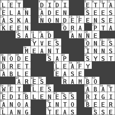 ACROSS 1. Allow 4. "You Light Up My Life" star Conn 8. Singer James 12. Flair 14. Arabian gulf 15. Observes 16. "____ silly question..." 17. Unrelated to defense, as in spending 20. Peachy ____! 21. Mouth or opening 22. Parent Teacher Association (abbr.) 23. Vegetable dish 27. Queen of England 1702-14 29. Jacques Cousteau's middle name 31. Washington bills 34. Intended 35. Restaurants 36. Connecting point 39. Plant excrement 41. System (abbr.) 42. Cy Young winner Saberhagen 43. Like summer trees 46. Competent 47. Relaxation 48. Ancient Greek god of war 51. Role for Stallone 54. Dripping 56. French article 58. Blind as ____ 61. The property of being fit to eat 66. Swiss mountan, "Queen of the Mountains" 67. Small Philippine buffalo 68. To the inside or interior of 69. Fermented drink made from hops 70. Austrian-born American filmmaker Fritz 71. Beverages made from leaves 72. Compass dir. DOWN 1. Path through which fluid escapes 2. Otherwise 3. Proceeds 4. One of the 12 tribes of Israel 5. Wedding promise 6. Lair 7. _ china 8. Compass dir. 9. 3-inch nail 10. Trial 11. Toward the sea 13. Nanny 18. Epoch 19. Air blower 24. Potassium hydroxide 25. Actress Gardner 26. Cub Scout units 28. Annoyingly loud 30. Lacking originality or spontaneity 32. Followers of ems 33. Fast jet (abbr.) 34. Distance measurement 36. Basketball assoc. 37. Globe 38. Conveyance 40. Lightbulb-shaped fruit 44. White ___ sheet 45. Opposite of masc. 49. Pipe bend 50. Observe 52. Sharp remark 53. Off-Broadway awards 54. Welt 55. Pulitzer Prize-winning author Ferber 57. In a ____ (agitated or irritated) 59. Matures 60. Hoop that covers a wheel 62. Container for groceries 63. Compass dir. 64. R.R. building 65. Distress signal