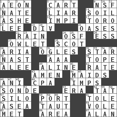 ACROSS 1. A really long time 5. Draw slowly or heavily 9. Science/research agcy. 12. Nathan's nickname 13. One who doesn't tell the truth 14. Earth 15. American tennis player Robert 16. Body of Kaffir warriors 17. "Corrida" creature 18. Area sheltered from the wind 19. HTML Container Element 21. Fertile tracts in a desert 22. Precipitation 24. Order of Saint Francis (abbr.) 26. Curvy letter 27. A small or young owl 28. Native of Scotland 29. Operatic vocal solo 30. Stares 32. Play the lead 36. Political cartoonist Thomas 37. American Automobile Association (abbr.) 38. Drink excessively 39. Toward shelter 40. Place in a line 42. Pace 43. So be it 44. Unmarried girls 46. Cuckoo 49. Accounting whiz (abbr.) 50. Naughty children 51. Message 53. Epoch 54. Make lace 57. Grain storage tower 58. Left side of a ship or aircraft 61. Lacquered or enameled metalware 62. Toward the sea 63. Drawn tight 64. Short-tailed, large-bodied rat 65. Was introduced to 66. Length times width 67. ____ Jay Lerner DOWN 1. Of or related to the anus 2. Comfort 3. Else 4. Born 5. 154 in Roman numerals 6. Direct toward a target or goal 7. Reproach for some lapse or misdeed 8. Three (prefix) 9. Trap for birds or small mammals 10. Fathers 11. Soft thread for cleaning between teeth 14. R.R. building 19. Expire 20. To the inside or interior of 21. Often (poetically) 23. Having winglike extensions 24. Sea 25. Distress signal 27. Relating to the mouth 28. Killed 29. Santa ___, CA 31. An organ shaped like a helmet 32. Remove all contents or possession from 33. Inedible or poisonous agaric 34. Flats, for short 35. To riddle 40. Electrical Unit 41. Arab leader 43. Adept person 45. Nanny (var.) 46. Indian state 47. Annoying sound 48. An arm off of a larger body of water 52. ___ good deed 53. Singer James 55. Silent film actress Nazimova 56. Adolescent 58. Parent Teacher Assoc. 59. Rowing implement 60. Sorrow 61. Federal power corp.
