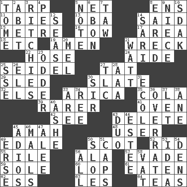 ACROSS 1. Canvas cover 5. Fish or hair follower 8. Followers of ems 11. Off-Broadway awards 13. Chief or king in Benin or Nigeria 14. Expressed in words 15. Distance measurement (Brit.) 16. Pull behind 17. Length times width 18. And so on (abbr.) 19. So be it 21. Raze 22. Stockings 24. Helper 25. A glass for beer 27. Make lace 29. Downhill vehicle 30. Schedule 32. Otherwise 33. N. Chile seaport 35. Root beer relative 39. More uncommon 41. Baking chamber 42. Observe 43. Erase 45. Wet nurse 48. One who makes use of a thing 49. Peak District village in England 50. Highlander 52. To free from 55. Cause heat under the collar 56. According to 57. Dodge 59. Not divided or shared with others 60. Chop off 61. Ingested 62. Double-curved letter 63. French article 64. Beverages made from leaves DOWN 1. Heavy book 2. Collude with 3. Actors Guy, Robert Welles, and Clint 4. For each 5. Brief written record 6. Inky black, to poets 7. The 23rd letter of the Hebrew alphabet 8. Having ears or earlike features 9. Sibling's daughter 10. Neighbor of Neb. 12. Gospel singer Marvin 14. Indian skirt 20. Cartoonist voice _ Blanc 21. Electrical Unit 23. More peculiar 25. Compass dir. 26. Pipe bend 27. Affectionate concern, for short 28. Auto club (abbr.) 30. Title for a knight 31. Learning spot: Fr. 33. "We ___ not amused" (Victoria) 34. Portuguese money of account (variant) 36. Make much ado about nothing 37. Allow 38. A saturated hydrocarbon 40. American tennis player Robert 43. Superhero pair 44. First name in cosmetics 45. Goodbye (Sp.) 46. Promenades 47. Toward shelter 49. Celtic language 50. _ gin 51. Smile enhancers 53. The content of cognition 54. Cub Scout units 56. 100% 58. Large container