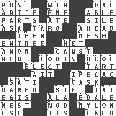 ACROSS 1. Mail 5. Acquire through effort 8. Clumsy lout 11. Nick name for Arthur 13. Compass dir. 14. Competent 15. Pieces 16. Had dinner 17. Drop; flow; fall 18. White ___ sheet 19. Pacific island yam 21. Forward in time 22. Adolescent 24. Tender 25. Main course 27. Was introduced to 29. At once, immediately (arch.) 30. 2nd pers. sing. pres. of can (arch.) 32. Painter Guido (1575-1642) 33. Plunders 35. Mitch Miller's instrument 39. Opt 41. Small pie 42. Small island 43. Medicinal drug used to evoke vomiting 45. Suttee (variant) 48. Keg 49. More uncommon 50. Proofreading order 52. Make lace 55. The front part of a cuirass 56. Insect wing 57. Peak District village in England 59. A home for chicks 60. Dreamland 61. High-strength synthetic material 62. Compass dir. 63. It is 64. Made supply last DOWN 1. Dad 2. Mouths or openings 3. Ski resort town in Vermont 4. Teat (slang) 5. Put on (as clothing) 6. To the inside or interior of 7. Born 8. Off-Broadway awards 9. Assad's deity 10. Nourish 12. First name in cosmetics 14. American tennis player Robert 20. A saturated hydrocarbon 21. Pismires 23. Bert's buddy 25. Ewer handle 26. Compass dir. 27. Floor covering 28. Followers of ems 30. Small bed 31. Lugs 33. Luau accessory 34. Sep. follower 36. Sass 37. Mouth or opening 38. And so on (abbr.) 40. Den 43. Frozen water 44. Eucharist need 45. Gurus 46. Originate 47. Trial 49. French philosopher Descartes 50. Position in a hierarchy or organization 51. Small boys 53. _ vera 54. Look after 56. Cuckoo 58. Color