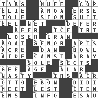 ACROSS 1. Bar bills 5. Perform or handle clumsily 9. Police officer (slang) 12. Writer Wiesel 13. Small Philippine buffalo 14. Celtic language 15. Lacquered or enameled metalware 16. The Jewish people; Israel 17. Set or collection 18. Snakelike fish 19. Fish or hair follower 21. Postpone 22. Fermented drink made from hops 24. Frozen water 26. Three (prefix) 27. Failure 28. SW Asia republic 29. Water vessel 30. Sir (Sp.) 32. Tenement units (abbr.) 36. 43,560 square feet 37. Daniel's nick name 38. Soup holder 39. Helper 40. 2nd pers. sing. pres. of can (arch.) 42. Like ___ of sunshine 43. Flatfish 44. Religious groups 46. Turn to the right 49. Personal question 50. Having or resembling wings 51. Difficult 53. Big collection agency 54. Atmosphere 57. Von Bismarck 58. Inky black, to poets 61. "You Light Up My Life" star Conn 62. Rendezvous 63. For fear that 64. Detail 65. Followers of ems 66. Information 67. He sold his birthright DOWN 1. Wig 2. Medicinal plant 3. Big road sign 4. Observe 5. Vertical spar for supporting sails 6. Corn or form start 7. Egg _ yung 8. Avid follower 9. An unpleasant substance 10. Flexible twig of a willow tree 11. _ dish (used to culture cells) 14. Compass dir. 19. Born 20. Blunders 21. Lair 23. First name in cosmetics 24. Metal shackles 25. 4-wheeled motor vehicle 27. Locales 28. Empty; void 29. Sound made by sheep 31. Peak District village in England 32. Phillipine bananalike plant 33. Likenesses of persons 34. It was, poetically 35. Insidious 40. Gear tooth 41. Russian ruler of old 43. Declare 45. Raised railways 46. Dwarf 47. Consumed 48. _____ Park, CO 52. Small child 53. To the inside or interior of 55. It may be bright or harebrained 56. Tall New Zealand timber tree 58. Biblical high priest 59. Benjamin's nick name 60. Order of Saint Francis (abbr.) 61. Pass on