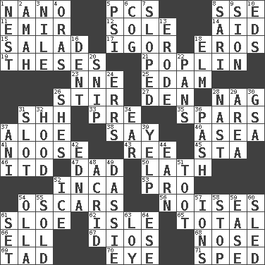 ACROSS 1. Billionth: prefix 5. Personal Computers (abbr.) 8. Compass dir. 11. Arab leader 12. Flatfish 14. Assist 15. First course 17. Composer Stravinsky 18. Greek god of love 19. College papers 21. Cotton for raincoats, e.g. 23. Compass dir. 25. Dutch treat 26. Commotion 27. Lair 28. Tired old horse 31. Quiet! 33. Before (prefix) 35. Practice fights 37. _ vera 38. Declare 40. Toward the sea 41. Trap for birds or small mammals 43. To sift 45. R.R. building 46. It would 47. Male parent 50. Thin strip of wood or metal 52. South American Indian 53. Adept person 54. Motion picture awards 56. Annoying sounds 61. _ gin 62. Small island 65. "_____ Recall" 66. Pipe bend 67. "Vaya con ____" 68. Characteristic smell of wine 69. Small boy 70. Sight organ 71. Hurried DOWN 1. A home for chicks 2. Nursemaid 3. "Death on the ____" 4. Mouths or openings 5. Air pressure measure (abbr.) 6. Gear tooth 7. Had an oblique or slanted direction 8. Indian skirt 9. The Jewish people; Israel 10. Begley and Asner 13. Eat (away) 16. Gouge 18. Shade tree 20. Clip 22. Zero-star reviews 24. Blunders 26. "______ My Girl" (Turtles hit) 28. Political cartoonist Thomas 29. Length times width 30. Girls' org. (abbr.) 31. Groove 32. Parka part 34. Ewer handle 36. Romantic infatuation 37. Cuckoo 39. Sharp bark 42. Pulitzer Prize-winning author Ferber 44. Merit 48. Sour-tasting 49. Small ungulate mammals of Africa 51. A blast of a horn 52. Frozen water 54. Spanish pot 55. Disposed of to a purchaser 57. Charged atoms 58. Constrict 59. Relaxation 60. Downhill vehicle 61. Arrange properly for use 63. Myrna of the movies 64. Compass dir.