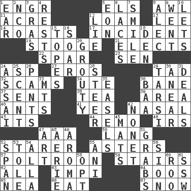 ACROSS 1. Engineer (abbr.) 5. Raised railways 8. Leather borer 11. 43,560 square feet 12. Rich soil 13. Area sheltered from the wind 14. Ridicules or criticizes harshly 17. Happening 19. Moe Howard, for one 21. Chooses 22. Practice fight 23. Elected rep. 24. Cleo's killer 27. Greek god of love 29. Bit 32. Fraudulent business schemes 34. Shoshoni 36. Object of repulsion 37. Transmitted 38. Afternoon social gathering 39. Type of rug 40. Pismires 41. It is so 42. Relating to the nose 43. It is 44. San ____ (Riviera town) 46. Big collection agency 47. American Automobile Association (abbr.) 50. Austrian-born American filmmaker Fritz 52. A viewer who gazes fixedly 55. Michaelmas daisies 57. Coward 59. Flight of steps 62. Everything 63. Body of Kaffir warriors 64. Scornful sounds 65. Teachers' org. 66. Ingest 67. Overwhelm DOWN 1. Hearing organ 2. Non-commissioned officer (abbr.) 3. Pate de foie ____ 4. Musical pauses 5. A really long time 6. Shoestrings 7. Grin 8. Actor Baldwin 9. Gone 10. Allows 12. Whopper 15. Drinks excessively 16. Fly high 18. Lair 20. Cross 24. Slender Brazilian palm 25. Odor 26. Leg coverings 28. Navigate 29. Tarsus (plural) 30. Approach 31. Allots cards 33. Mountains (abbr.) 35. Artist's stands 36. Sound made by sheep 42. Music written for nine 45. Floor protectors 47. Tate display 48. Nest on high 49. Odor 51. Takes hold of 52. Connect, as a bridge 53. Lacquered or enameled metalware 54. Silent film actress Nazimova 55. Black tropical American cuckoo 56. The Jewish people; Israel 58. Choose 60. Friend of Pooh 61. Compass dir.
