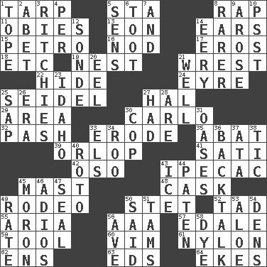 ACROSS 1. Canvas cover 5. R.R. building 8. Reproach for some lapse or misdeed 11. Off-Broadway awards 13. Period of immesurable duration 14. Hearing organs 15. Stone: prefix 16. Allow head to fall sleepily 17. Greek god of love 18. And so on (abbr.) 19. Egg locale 21. Take or capture by force 22. Flintstone garb 24. Jane of fiction 25. Beer mug 27. Actor Linden 29. Type of rug 30. Monte _, Las Vegas Hotel/Casino 32. Romantic infatuation 33. Wear away 35. Blind as ____ 39. Lowest deck of a ship 41. Suttee (variant) 42. Bear (Spanish) 43. Medicinal drug used to evoke vomiting 45. Vertical spar for supporting sails 48. Keg 49. Cowboy competition 50. Proofreading order 52. Bit 55. Operatic vocal solo 56. Auto club (abbr.) 57. Peak District village in England 59. Utensil 60. Zeal 61. Thermoplastic polyamide 62. Followers of ems 63. Begley and Asner 64. Makes supply last DOWN 1. Drink excessively 2. Collude with 3. Actors Guy, Robert Welles, and Clint 4. For each 5. Elected reps. 6. A blast of a horn 7. Added to 8. Less widely known 9. Came up 10. Inconspicuous attention getter 12. Message 14. Suggestive of the supernatural 20. Snakelike fish 21. Water source 23. Potato state 25. Plant excrement 26. Epoch 27. Possessed 28. "We ___ not amused" (Victoria) 30. Police officer (slang) 31. Fertile tracts in a desert 33. Raised railways 34. Friend of Pooh 36. Sass 37. "One Day ___ Time" 38. Nervous spasm 40. Printing process, for short 43. Frozen water 44. Eucharist need 45. Person of subnormal intelligence 46. Goodbye (Sp.) 47. Lick closed 49. Assign a rank or rating to 50. Stated 51. Scottish caps 53. _ vera 54. Habitations of wild animals 56. "___ Maria" 58. Color