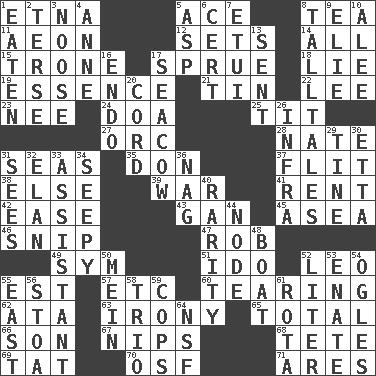ACROSS 1. Inactive volcano in Sicily 5. Adept person 8. Afternoon social gathering 11. Period of immesurable duration 12. Arranges properly for use 14. 100% 15. Heavy duty weighing machine 17. Upset 18. Untruth 19. Center 21. Metal container 22. Area sheltered from the wind 23. Born 24. ___ good deed 25. Teat (slang) 27. The grampus (Milton) 28. Nathan's nickname 31. Oceans 35. Spanish title 37. Sudden quick movement 38. Otherwise 39. Armed conflict 41. Monthly bill 42. Relaxation 43. Separate the seeds from cotton 45. At sea 46. Sever or remove by pinching or nipping 47. Director Reiner 49. Symbol (abbr.) 51. Wedding promise 52. Lion 55. Eastern Standard Time (abbr.) 57. And so on (abbr.) 60. Rending 62. _ moment's notice (2 wds.) 63. Literary sarcasm 65. "_____ Recall" 66. Manchild 67. Cuts off 68. Wig 69. Make lace 70. Order of Saint Francis (abbr.) 71. Ancient Greek god of war DOWN 1. Eroded 2. Laconic 3. Trap for birds or small mammals 4. Singer Murray 5. Cleo's killer 6. Certainty 7. Needle holder 8. Baron Munchausen's specialties 9. Writer Wiesel 10. Toward shelter 13. Posted 16. Inside; within (prefix) 17. Manatee 20. Drawstring 26. Kind of red light 29. Prong on a fork 30. Singer James 31. Observes 32. Flair 33. Aide 34. Oozy 36. Tired old horse 40. Noteworthy scarcity 44. Thickened enlargement 48. Water vessel 50. Chow _ 52. 61 cubic inches 53. Maternal 54. Stares 55. 90 degrees 56. Portico 58. Musical group of three 59. 911 reaches them 61. Round or rotation of duties 64. Overdraft (abbr.)