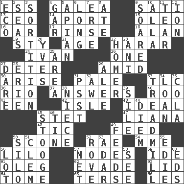 ACROSS 1. Curvy letter 4. An organ shaped like a helmet 9. Suttee (variant) 13. Corporate head (abbr.) 14. To the left, to Queeg 15. Margarine 16. Rowing implement 17. Remove soap 18. ____ Jay Lerner 19. Filthy place 21. Grow older 22. Ethiopian city, capital of Harari 24. _ the terrible 26. Single 27. Prevent from occurring 29. Among 30. Originate 31. Diluted with white 33. Affectionate concern, for short 36. _ de Janeiro 37. Responds (to) 40. Friend of Pooh 41. Car or cant ending 42. Capri or Wight 43. Standard of perfection 45. Proofreading order 47. Climbing, woody, usually tropical vines 48. Nervous spasm 49. Nourish 50. Biscuitlike quick bread 52. Actress Charlotte 54. Madame (abbr.) 56. _ and Stitch 57. Methods 59. Binary compound 61. Cassini of fashion 62. Elude 63. Hat (slang) 64. Heavy book 65. Laconic 66. French article DOWN 1. Environmental prefix 2. Oceans 3. Determination 4. Slender fish 5. Bee-related 6. Having great length 7. Celtic language 8. Had dinner 9. Flew 10. Silent film actress Nazimova 11. Pull into pieces 12. Electrically charged atom 20. Jacques Cousteau's middle name 22. Home run 23. Black tropical American cuckoo 25. Length times width 27. Have the gumption 28. 4th largest of the Great Lakes 29. Toward shelter 31. Inconspicuous attention getter 32. Leather borer 33. Excercise machine 34. Grant temporary use of 35. Root beer relative 38. Sibling's daughter 39. Filth; sediment 44. South Vietnam president (1954) 45. Moe Howard, for one 46. Shallow baking pan 49. Gives food to 50. Grain storage tower 51. Clement's nick name 52. Be footloose 53. The sixth month of the Jewish calendar 55. Singer Brickell 56. Car dealer's back yard 57. Was introduced to 58. Perceive with the eye 60. Begley and Asner