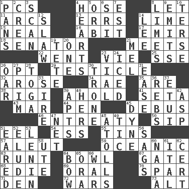 ACROSS 1. Personal Computers (abbr.) 4. Stockings 8. Allow 11. Curves 13. Blunders 14. Citrus frut 15. Actress Patricia 16. "This won't hurt ____!" 17. Arab leader 18. Legislator 21. Confronts 22. Gone 23. Compete 25. Compass dir. 26. Choose 29. One of the two male reproductive glands 32. Came up 34. Actress Charlotte 35. "We ___ not amused" (Victoria) 38. Swiss mountan, "Queen of the Mountains" 39. Hold, grip (Informal) 41. Stalk of a moss capsule 43. Make imperfect 44. Fenced enclosure 45. Alight from a bus 46. Plea 50. Small drink 51. Snakelike fish 54. Double-curved letter 55. Canisters 57. Eskimo relative 59. Pertaining to the sea 63. The smallest animal of a litter 64. Soup holder 67. Yard entry 68. Singer Brickell 69. Relating to the mouth 70. Coast Guard woman 71. Lair 72. Armed conflicts 73. Keyboard modifier key DOWN 1. Baking dishes 2. Algonquian 3. Examine minutely or intensely 4. Centers 5. Globe 6. Indian title of respect (Mr.) 7. Eastern Standard Time (abbr.) 8. Citrus fruits 9. Sends forth 10. Laconic 12. Cole _ (cabbage dish) 14. Area sheltered from the wind 19. Wig 20. Single 21. Cartoonist voice _ Blanc 23. Small bottle 24. On the rocks 26. Rowing implement 27. Demure 28. Ancient Roman robe 30. Heavy duty weighing machine 31. Relaxation 33. Father 36. Confederate soldiers (slang) 37. Needle case 39. Tenement units (abbr.) 40. Possessive pronoun 42. Viper 45. Centimeter-gram-second unit of force 47. Remaining after all deductions 48. Ringlike coral islands and reefs 49. Nervous spasm 51. Having ears or earlike features 52. Evade 53. Soviet premier 1918-24 56. Droops 58. Shoshoni 60. California wine valley 61. Slanted text style (abbr.) 62. An absolute certainty 64. Ribbon knot 65. Mouth or opening 66. Armed conflict