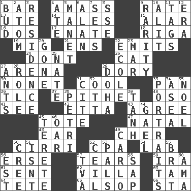ACROSS 1. Drinking establishment 4. Collect or gather 9. Pace 13. Shoshoni 14. Falsehoods 15. Having or resembling wings 16. Two (Sp.) 17. Maternal 18. Capital of Latvia 19. Russian fighter aircraft 21. Followers of ems 22. Sends forth 24. Do not 26. Domesticated feline 27. Sports stadium 29. Rowboat 30. Music written for nine 31. Calm and collected 33. Baking dish 36. Affectionate concern, for short 37. Curse 40. Bear (Spanish) 41. Perceive with the eye 42. Singer James 43. Match 45. Carry 47. Brizilian seaport 48. Ewer handle 49. "Mermaids" star 50. High-altitude cloud 52. Tax preparer (abbr.) 54. Experiment locale 56. Celtic language 57. Pulls apart 59. Retirement account (abbr.) 61. Transmitted 62. Country estate 63. Scottish cap 64. False hair 65. Columnist Joseph or Stewart 66. R.R. building DOWN 1. Partially opened flower 2. Smallest unit of an element 3. Dwelling 4. Had dinner 5. French painter Edouard 6. ____ Jay Lerner 7. Arranges properly for use 8. Compass dir. 9. Noteworthy scarcity 10. Came down and settled, as after flight 11. Labels 12. Epoch 20. Went 22. Learning spot: Fr. 23. Impair 25. Nathan's nickname 27. Pismires 28. Hero or heavy, e.g. 29. Capital of the state of Qatar 31. Quote 32. Baseball player Mel 33. Likenesses of persons 34. At sea 35. Christmas carol 38. _ dish (used to culture cells) 39. Hyperbolic tangent 44. Highlander 45. Cylindrical with tapered ends 46. Rowing implement 49. Monte _, Las Vegas Hotel/Casino 50. Algonquian 51. Is not 52. To provide with a ceiling 53. Friends 55. Naughty child 56. Eastern Standard Time (abbr.) 57. Federal power corp. 58. Plant excrement 60. Nursemaid (var.)