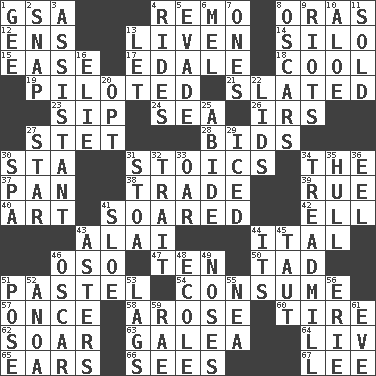 ACROSS 1. Girls' org. (abbr.) 4. San ____ (Riviera town) 8. Mouths or openings 12. Followers of ems 13. Make or become more lively 14. Grain storage tower 15. Relaxation 17. Peak District village in England 18. Calm and collected 19. Manned the helm 21. Scheduled 23. Small drink 24. Ocean 26. Big collection agency 27. Proofreading order 28. Auction offers 30. R.R. building 31. Unemotional ones 34. Definite Article 37. Baking dish 38. Exchange 39. Sorrow 40. Nonscientific branch of learning 41. Flew 42. Pipe bend 43. Mountain range southwest of Kyrgyzstan 44. Slanted text style (abbr.) 46. Bear (Spanish) 47. Nine, plus one 50. Bit 51. Soft color 54. Ingest 57. At one time in the past 58. Came up 60. Hoop that covers a wheel 62. Fly high 63. An organ shaped like a helmet 64. 54 in ancient Rome 65. Hearing organs 66. Observes 67. Area sheltered from the wind DOWN 1. Turn to the right 2. Fastener 3. Helper 4. Amusement-park features 5. Elude 6. Cartoonist voice _ Blanc 7. Washington bills 8. Motion picture awards 9. Debaucheries 10. _ vera 11. Exchanged or delivered for money 13. Allow 16. Writer Wiesel 20. Choose 22. Flaplike coverings 25. Stay 27. Play the lead 29. On the rocks 30. Health resort 31. Portico 32. Distinguishing feature 33. Boat paddle 34. Excercise machine 35. Frame or body of a ship 36. Snakelike fish 41. _ gin 43. Michaelmas daisies 44. It is 45. Pulled tight 46. Witty Wilde 48. Learning spot: Fr. 49. Olfactory organs 51. Airs 52. Small Philippine buffalo 53. Fails to keep up a pace 55. Teachers' org. 56. 4th largest of the Great Lakes 59. Actress Charlotte 61. Night before a holiday