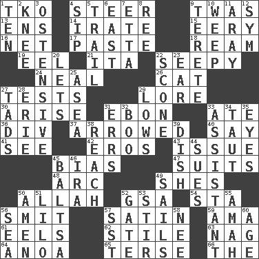 ACROSS 1. Ring climax 4. Bull 9. It was, poetically 13. Followers of ems 14. Feeling or showing extreme anger 15. Suggestive of the supernatural 16. Fish or hair follower 17. Thick mixture 18. 480, 500 or 516 sheets of paper 19. Snakelike fish 21. Call ___ day 22. Not well drained, as in land 24. Actress Patricia 26. Feline 27. Trials 29. Old wives' tales, e.g. 30. Get up 31. Inky black, to poets 33. Had dinner 36. HTML Container Element 37. Moved like an arrow 40. Declare 41. Observe 42. Greek god of love 43. Come out of 45. Prejudice 47. Sets of matching outer garments 48. Curve 49. "______ My Girl" (Turtles hit) 50. Assad's deity 52. Girls' org. (abbr.) 54. R.R. building 56. Stricken, poetically 57. Smooth fabric 59. Nanny (var.) 61. Snakelike fish 62. Vertical member of a panel or frame 63. Tired old horse 64. Small Philippine buffalo 65. Laconic 66. Definite Article DOWN 1. "___ Little Indians" 2. Leg joint 3. Clearly or manifestly demonstrative 4. Small drink 5. Go after with the intent to catch 6. 90 degrees 7. Singer James 8. To riddle 9. Cigar-shaped 10. Shed a tear 11. Like ___ of sunshine 12. Symbol (abbr.) 20. Allows 22. Biscuitlike quick bread 23. Ewer handle 25. Toward the sea 27. Bits 28. One of the Great Lakes 29. Moos 31. Blunders 32. Sometimes accompanies a hiss 33. Helper 34. Pulled tight 35. Sight organs 38. Arrive at 39. Food container 44. Takes to court 45. Greek mezzo-soprano Agnes 46. Retirement account (abbr.) 49. Travels by water 50. So be it 51. _ and Stitch 52. Yard entry 53. Agitate 55. Wet nurse 56. Ocean 57. Fast jet (abbr.) 58. Born 60. Mature