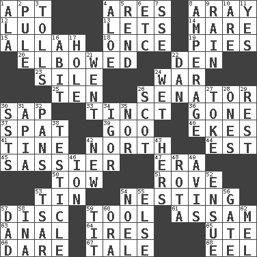 ACROSS 1. Fitting 4. Ancient Greek god of war 8. Like ___ of sunshine 12. Nilotic language 13. Allows 14. Female horse 15. Assad's deity 18. Single time 19. Sliced desserts 20. Turned at an angle; bent 22. Lair 23. Drop; flow; fall 24. Armed conflict 25. Nine, plus one 26. Elected representative 30. Plant excrement 33. Colored lightly or faintly 36. Went 37. Petty quarrel 39. Thick or sticky substance 40. Supplements with great effort 41. Prong on a fork 42. 0 degrees 44. Eastern Standard Time (abbr.) 45. More disrespectful 47. Period 50. Pull behind 51. Be footloose 53. Metal container 54. Snuggling 57. Flat circle 59. Instrument 61. Indian state 63. Of or related to the anus 64. Angers 65. Shoshoni 66. Have the gumption 67. Lie 68. Snakelike fish DOWN 1. Wing 2. Whimper 3. For Whom the Bell _____ 4. Medicinal plant 5. Tear apart 6. And so on (abbr.) 7. Compass dir. 8. Electrical Measurement 9. Precipitation 10. "We ___ not amused" (Victoria) 11. Consenting reply 16. "This won't hurt ____!" 17. Opening into or through something 21. Left 22. Daniel's nick name 24. Dripping 26. Highlander 27. Puff or smoke 28. Washington bills 29. Respite 30. Fast planes 31. Capital of Western Samoa 32. Baking dishes 34. Composer Stravinsky 35. Not either 38. A testis 42. ___ Haven, CT 43. Possessive pronoun 46. Electrically charged atom 48. Round or rotation of duties 49. Advice 52. Take place subsequently 53. Russian ruler of old 54. Christmas carol 55. Otherwise 56. Yard entry 57. Male parent 58. _ tizzy (2 wds.) 59. Teat (slang) 60. Mouth or opening 62. Cartoonist voice _ Blanc