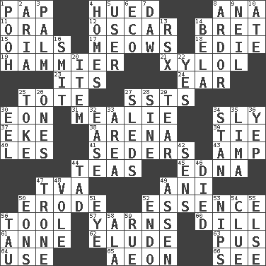 ACROSS 1. Infant food 4. Became colored 8. Santa ___, CA 11. Mouth or opening 12. Witty Wilde 14. Cy Young winner Saberhagen 15. Lubricates 17. Catcalls? 18. Singer Brickell 19. More overdramatic by comparison 21. Xylene (variant) 23. It is 24. Hearing organ 25. Lug 27. Fast planes 30. Period of immesurable duration 31. Ear of corn 34. Cunning 37. Supplement with great effort 38. Sports stadium 39. Neckwear 40. French article 41. Spring feasts 43. Electrical Unit 44. Afternoon social gatherings 45. Pulitzer Prize-winning author Ferber 47. Federal power corp. 49. Black tropical American cuckoo 50. Eat (away) 52. Gist 56. Utensil 57. Entertaining tales 60. Deli pickle 61. Singer Murray 62. Evade 63. Fluid product of inflammation 64. Purpose 65. Period of immesurable duration 66. Perceive with the eye DOWN 1. "Silly old bear" 2. Roberta Peters solo 3. Inside of hand 4. Dwellings 5. One who uses or employs something 6. Environmental prefix 7. Simpleton 8. Zeal 9. Famous astronaut Armstrong 10. Had dinner 13. Acura sports coupe 14. Actor Lugosi 16. Stricken, poetically 20. A distinct part 22. Affirmative reply 25. Puff or smoke 26. Washington bills 27. Bobsleighs 28. Trig term 29. Lacerate 30. Snakelike fish 32. Comfort 33. Type of rug 34. Comedian Laurel of Laurel & Hardy 35. Pale green bean 36. Slangy assent 42. Elected reps. 44. Bit 46. Passed on 47. Heavy duty weighing machine 48. Grand slam 49. NE Netherlands city 50. Immeasurably long periods of time 51. Sight organ 52. Inside; within (prefix) 53. Pinches, bites 54. A slight indication 55. Otherwise 56. The 19th letter of the Greek alphabet 58. Insect wing 59. Regret
