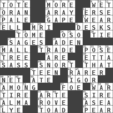 ACROSS 1. Lug 5. Greater amount 9. Dripping 12. NW Algerian seaport 13. Like ___ of sunshine 14. Celtic language 15. Diluted with white 16. Stare wonderingly 17. Erode 18. Pipe bend 19. Medical imaging device (abbr.) 21. Writing tables 22. Heavy book 24. Bear (Spanish) 26. Make a knot 27. Gurus 28. An important port of Yemen 29. Shopping center 30. Exchange 32. Introduce or present, as a question 36. Family _ (genealogy) 37. "We ___ not amused" (Victoria) 38. Singer James 39. Backtalk 40. Derisive sound 42. Not this but _ 43. Adolescent 44. More valued for its uncommonness 46. Remaining after all deductions 49. Had dinner 50. Composer Stravinsky 51. Amid 53. Enemy 54. Armed conflict 57. Become fatigued 58. Johnson of "Laugh-In" 61. The founder of a family 62. _ mater 63. Be footloose 64. At sea 65. Sodium hydroxide 66. Frog relative 67. Lightbulb-shaped fruit DOWN 1. Drink excessively 2. Taken by mouth 3. Baron Munchausen's specialties 4. Compass dir. 5. Wise men 6. Mouth or opening 7. Strike 8. Sight organ 9. Take or capture by force 10. 1973 Nobel Price Winner (Physics) Leo 11. Laconic 14. She-sheep 19. Madame (abbr.) 20. Take ten 21. Spanish title 23. Stares 24. More peculiar 25. Observe 27. "Two Mules for Sister ____" 28. Composer Copland 29. Mountains (abbr.) 31. Indian princess (variant) 32. Stone: prefix 33. Else 34. Play the lead 35. Consume 40. Put into a specified state 41. Musical group of three 43. Label 45. Mature 46. Relating to or accompanying birth 47. Poet Dickinson 48. Singer Mel 52. Teachers' org. 53. Nourish 55. Type of rug 56. Posterior 58. Tate display 59. Friend of Pooh 60. Federal power corp. 61. Plant excrement