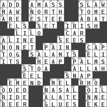 ACROSS 1. Increase 4. Collect or gather 9. Cole _ (cabbage dish) 13. Opening into something insatiable 14. _ pole 15. Heavy book 16. "We ___ not amused" (Victoria) 17. First name in cosmetics 18. Blind as ____ 19. Raised railways 21. Arrange properly for use 22. From or relating to Ireland 24. _ and Stitch 26. 4-wheeled motor vehicle 27. Place in a line 29. Observes 30. Music written for nine 31. Ache 33. Head covering 36. Coat; cloak 37. Deli grouping 40. Biblical high priest 41. ___ a Wonderful Life 42. Pile 43. Insides of hands 45. Portico 47. Assad's deity 48. Snakelike fish 49. Fastener 50. Make improvements or corrections to 52. Cartoonist voice _ Blanc 54. 17th letter of the Greek alphabet 56. Wrote a lyric poem 57. Relating to the nose 59. Lubricate 61. Travel on or in a vehicle 62. Having winglike extensions 63. Compass dir. 64. Fermented drink made from hops 65. Adhesives 66. Supplement with great effort DOWN 1. Nursemaid (var.) 2. Have the gumption 3. Residences 4. A saturated hydrocarbon 5. With motion or animation 6. Johnson of "Laugh-In" 7. Proofreading order 8. A female animal or person 9. Flight of steps 10. Tennis shots 11. Housemaid 12. Soggy 20. Trig term 22. Ancient Celtic tribe of eastern Britain 23. Actress Charlotte 25. Allows 27. Opposed to 28. Spoils 29. Simple or foolish person 31. Entreaty 32. Auto club (abbr.) 33. Portable communications device 34. _ mater 35. Expression of disdain 38. Hold, grip (Informal) 39. Connect, as a bridge 44. Having or resembling wings 45. Sowing specialist 46. Nine, plus one 49. Schedule 50. Singer Brickell 51. Ancient Persian 52. Shopping center 53. Son of Isaac 55. Pig sound 56. Globe 57. Tired old horse 58. French article 60. Area sheltered from the wind