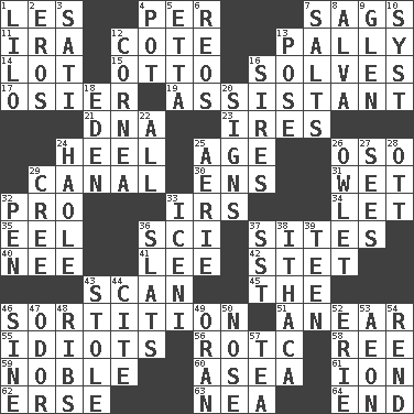 ACROSS 1. French article 4. For each 7. Settles 11. Retirement account (abbr.) 12. ____ d'Azur (French Riviera) 13. Friendly 14. Car dealer's back yard 15. Von Bismarck 16. Finds the solution 17. Flexible twig of a willow tree 19. Helper 21. Heredity factor (abbr.) 23. Angers 24. The bottom of a shoe or boot 25. Mature 26. Bear (Spanish) 29. Lessep's creation 30. Followers of ems 31. Soggy 32. Adept person 33. Big collection agency 34. Allow 35. Snakelike fish 36. _-fi 37. Settings 40. Born 41. Area sheltered from the wind 42. Proofreading order 43. Skim 45. Definite Article 46. Determination 51. Approach 55. Foolish or stupid persons 56. College mil. group 58. Portuguese money of account (variant) 59. Having high moral qualities 60. Toward the sea 61. Electrically charged atom 62. Celtic language 63. Teachers' org. 64. Conclusion DOWN 1. _ and Stitch 2. Greek god of love 3. Suttee (variant) 4. Plant holder 5. Singer James 6. Vintage cars 7. Table seasonings 8. Inventor's middle name 9. Small, secluded valley 10. System (abbr.) 12. Pupil covering 13. Airs 16. Founders of families 18. Locale of original sin 20. Attaches a signature 22. 100% 24. White Person, in Hawaii 25. Nest on high 26. A small or young owl 27. Observes 28. Baseball player Mel 29. Algonquian 32. Fenced enclosure 33. Ancient Celtic tribe of eastern Britain 36. Narrow boards 37. Fast jet (abbr.) 38. New York city 39. Adolescent 43. Fur scarf 44. Quote 46. Trig term 47. Aroma 48. Teases 49. Northwest Algerian city 50. Sense of smell 52. 4th largest of the Great Lakes 53. A really long time 54. Tear apart 57. Beverage made from leaves