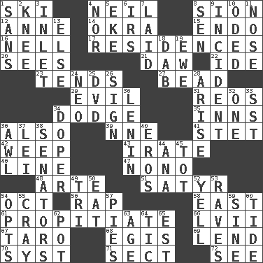 ACROSS 1. What Jean-Claude Killy likes to do 4. Famous astronaut Armstrong 8. The Jewish people; Israel 12. Singer Murray 14. Gumbo ingredient 15. Inside; within (prefix) 16. 1994 drama film starring Jodie Foster 17. Homes 20. Observes 21. Obsolete 22. Binary compound 23. Looks after 27. Necklace unit 29. Morally bad or wrong 31. Vintage cars 34. Evade 35. Restaurants 36. In addition 39. Compass dir. 41. Proofreading order 42. Shed a tear 43. Feeling or showing extreme anger 46. Actor's bit 47. Words to Nanette 48. Johnson of "Laugh-In" 51. Man with strong sexual desires 54. Sep. follower 56. Strike 58. 90 degrees 61. Conciliate 66. 57 in ancient Rome 67. Pacific island yam 68. Armor plate that protects the chest 69. Grant temporary use of 70. System (abbr.) 71. Religious group 72. Observe DOWN 1. Without 2. Leg joint 3. An arm off of a larger body of water 4. Not either 5. Supplement with great effort 6. Big collection agency 7. Put down 8. Elected rep. 9. Happening 10. Wrote a lyric poem 11. Characteristic smell of wine 13. Otherwise 18. Small moist lump or mass 19. She-sheep 24. Modern: prefix 25. Movie disc 26. Public display of a written message 28. Originate 30. Soviet premier 1918-24 32. Single 33. Fast jet (abbr.) 34. Drug addict 36. Leather borer 37. Flowery wreath 38. Elected representatives 40. Greek god of love 44. Santa ___, CA 45. Small child 49. Three (prefix) 50. Erode 52. Shout 53. All-night dance parties 54. Chooses 55. Supercomputer manufacturer 57. Sliced desserts 59. Trig term 60. Event that recurs at intervals 62. Plant holder 63. Grow older 64. Nervous spasm 65. Eastern Standard Time (abbr.)