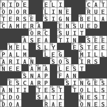 ACROSS 1. Travel on or in a vehicle 5. Connecticut Ivy Leaguer 8. Domesticated feline 11. Aroma 12. Actor's bit 14. Regret 15. Laconic 17. Signal 18. Actor Lugosi 19. Device for capturing images 21. Took place subsequently 23. The grampus (Milton) 25. Set of matching outer garments 26. At sea 27. Metal container 28. Perceive with the eye 31. Cartoonist voice _ Blanc 33. Roguish 35. First name in cosmetics 37. Inside of hand 38. Part of a journey 40. Place where flour is made 41. Believer in; advocate of (suffix) 43. Mayday 45. Big collection agency 46. Born 47. Wet nurse (var.) 50. For fear that 52. Fastener 53. Air blower 54. Fortification 56. Burns superficially 61. Against 62. Trial 65. For Whom the Bell _____ 66. Wedding promise 67. Suttee (variant) 68. A home for chicks 69. ___ good deed 70. Actress Charlotte 71. Washington bills DOWN 1. College mil. group 2. The content of cognition 3. Dormintory (informal) 4. Celtic language 5. Raised railways 6. Cards in a Roman deck? 7. Swallow 8. Algonquian 9. Old (Scot.) 10. Beverage made from leaves 13. World-weariness 16. Greek god of love 18. Yet 20. Ancient Greek god of war 22. Trig term 24. Give a ring to 26. _ mater 28. Use a swizzle stick 29. Snakelike fish 30. Snakelike fish 31. Female horse 32. Writer Wiesel 34. Consenting reply 36. Stricken, poetically 37. Baking dish 39. _ course 42. Grandmother 44. Oceans 48. Shops 49. Become visible 51. In a ____ (agitated or irritated) 52. _-fi 54. Inside; within (prefix) 55. Portico 57. Words to Nanette 58. Small, secluded valley 59. Otherwise 60. Fast planes 61. Help 63. R.R. building 64. Standoff