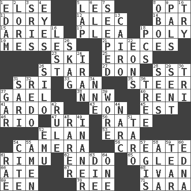 ACROSS 1. Otherwise 5. French article 8. Elect 11. Dinghy 12. Actor Baldwin 14. Long, evenly shaped piece 15. Satellite of Uranus 17. Entreaty 18. More than one (prefix) 19. Makes clutter 21. Parts 23. What Jean-Claude Killy likes to do 25. Greek god of love 26. Play the lead 27. Spanish title 28. Fast jet (abbr.) 31. Indian title of respect (Mr.) 33. Separate the seeds from cotton 35. Navigate 37. Highlander 38. Compass dir. 40. Painter Guido (1575-1642) 41. Zeal 43. A really long time 45. Eastern Standard Time (abbr.) 46. _ de Janeiro 47. RI univ. 50. Assign a rank or rating to 52. Flair 53. Epoch 54. Device for capturing images 56. Make 61. Tall New Zealand timber tree 62. Inside; within (prefix) 65. Stared 66. Had dinner 67. It's straight from the horse's mouth 68. "Terrible" tsar 69. Car or cant ending 70. To separate or throw off 71. "Two Mules for Sister ____" DOWN 1. Dutch treat 2. Old wives' tales, e.g. 3. Indian titles of respect 4. Sight organs 5. Pet locale 6. Pipe bend 7. Oozed 8. Mitch Miller's instrument 9. Friends 10. Attempt to accomplish something 13. Capital of Egypt 16. For fear that 18. Personal Computers (abbr.) 20. Heroin 22. Immeasurably long periods of time 24. SW Asia republic 26. Grain storage tower 28. Perceives with the eye 29. Transmitted 30. Three (prefix) 31. Indian skirt 32. Do over again 34. Compass dir. 36. Relationship diagram 37. Slender fish 39. Had on 42. General guideline 44. Drug cop 48. More uncommon 49. More empty; more void 51. Edible starchy tuberous root 52. Australian flightless bird 54. Quote 55. So be it 57. Armor plate that protects the chest 58. Inventor's middle name 59. Lacerate 60. Pulitzer Prize-winning author Ferber 61. Actress Charlotte 63. Pass on 64. Single